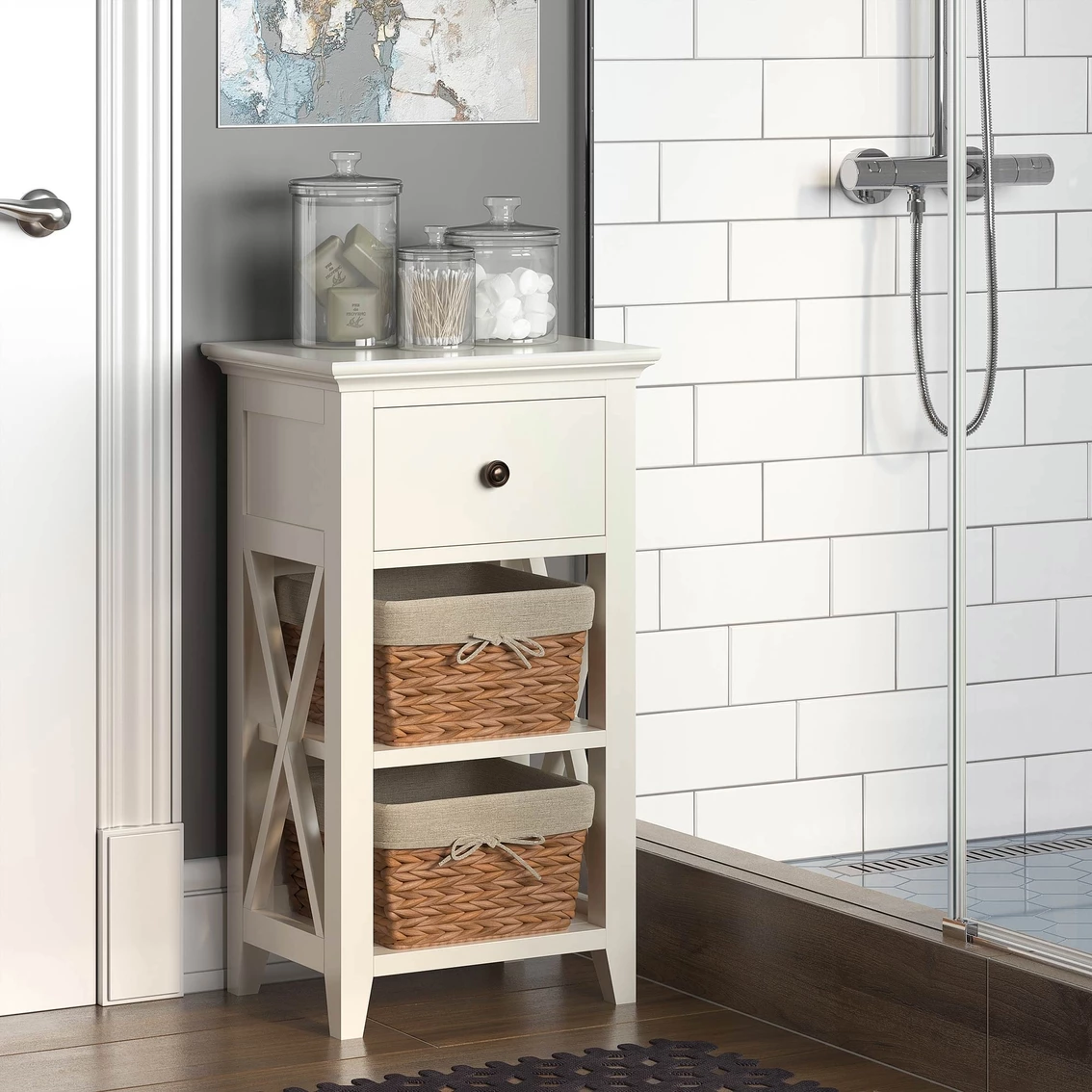 Who could resist this petite basket storage cabinet? A top drawer and two woven bins, both lined with sand-hued fabric, keep items hidden but accessible. The slim silhouette allows you to tuck this piece from Accentrics Home into even small bathrooms to provide extra space for necessities. The chest’s white finish is clean and crisp. The ‘X’ designed sides give even more character to this piece. Its coastal style fits any casual dΓ©cor. Model: DS-A049-857.