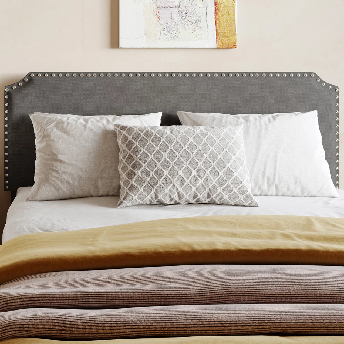With a simple, appealing clipped-corner silhouette and polished silver nail head trim, this upholstered headboard from Accentrics Home will make your bedroom feel chic, modern and inviting. The fabric offers a smooth, cushioned surface and coordinates effortlessly with any color scheme. Punctuated by ebony legs, this headboard attaches to any standard bed frame (sold separately) and is adjustable for the perfect fit. Model: DS-D500-250-1.