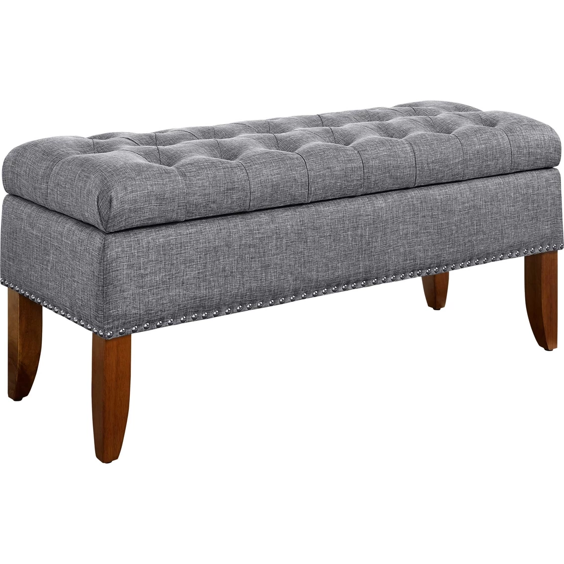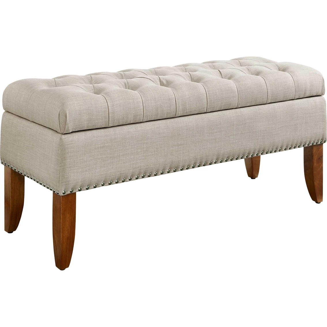 This storage bench from Accentrics Home combines sophisticated styling with practical features to create the ideal storage and seating option for your bedroom, entryway or den. Offering more style than your average storage bench, this piece sits atop tall flared legs, features a button tufted top and is trimmed in a row of glistening nail heads. The linen-like fabric in its neutral color way easily transitions to any setting. The interior offers plentiful space to tuck away everything from blankets and linens to sweaters and shoes, while a safety hinge allows for quick and easy opening and closing. Model: DS-D107003-619.