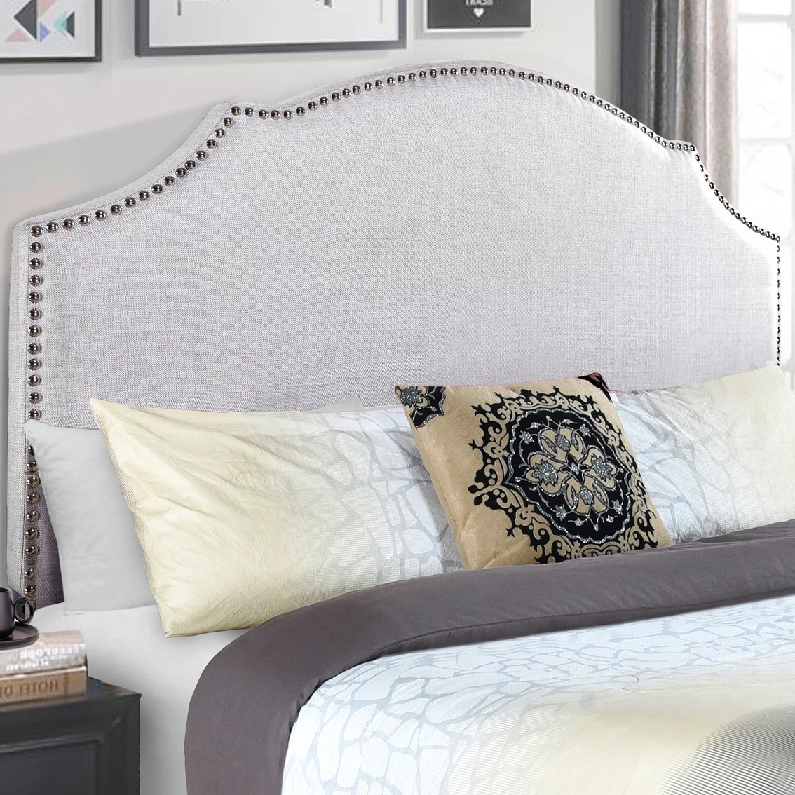 A gracefully shaped profile accentuated by nailhead trim makes this headboard from Accentrics Home a welcome addition to any bedroom. Ample padding and the linen-like fabric add extra luxury. This headboard also adjusts to accommodate mattresses of different thicknesses as well as different sized bed frames. Model: DS-D365-250-3.