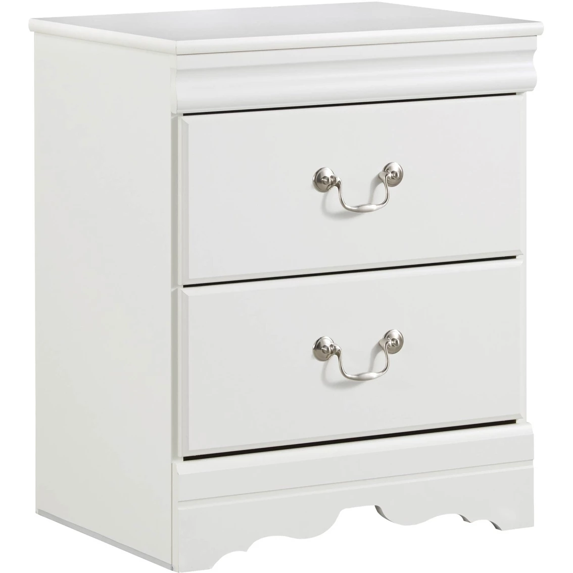 The crisp cottage white Anarasia 2-drawer nightstand from Ashley gives traditional Louis Philippe profiling a delightful style awakening. The look is timeless. The feel? Right at home. Two smooth-gliding drawers with antiqued bail pulls beautifully accommodate. Also features shapely top mouldings on the case pieces and an antiqued pewter color metal hardware complementing the Louis style as well. Model: B129-92.