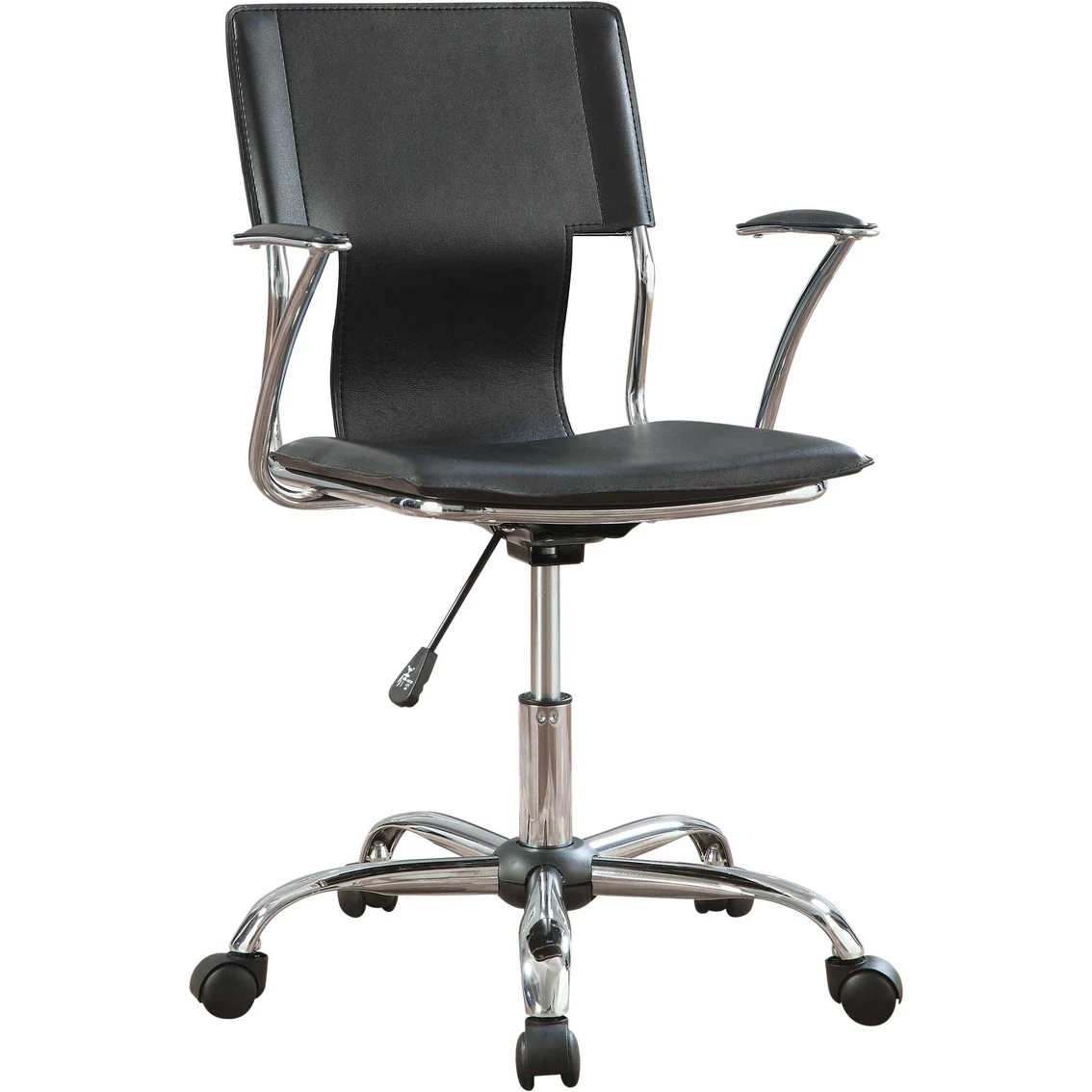 Freshen up an office space with a design-forward element. This Coaster Contemporary Black Sleek-Modern Office Chair features a no-nonsense design and an ultra comfortable seating experience. With black leatherette upholstery and chrome accents, it offers easy-care maintenance and a versatile palette. A slender molded seat and wide upper seat back offer a silhouette that’s inspiring and edgy. Adjustable seating heights and a spoke style caster wheel base ensure tailored comfort and mobility. Assembly required. Model: 800207.