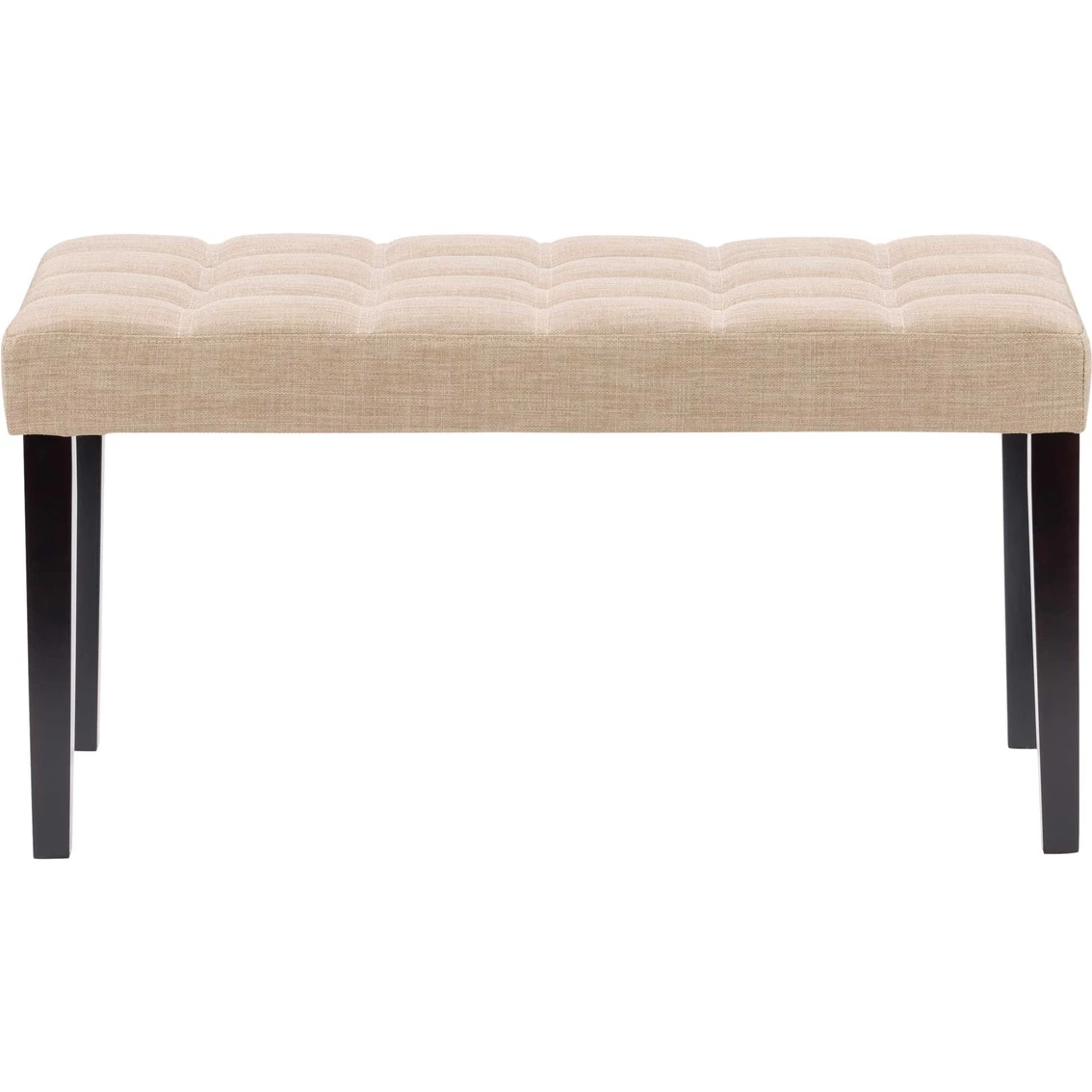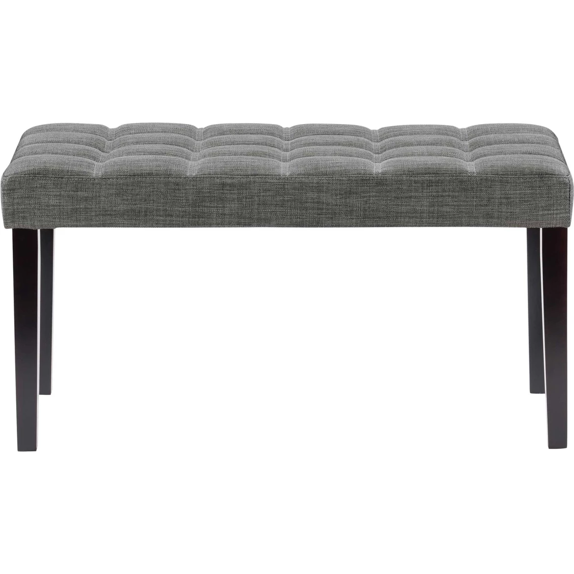 The soft fabric is complemented by dark stained wood legs for durability and style. This multi-functional seat provides a practical solution for entryways, living rooms, or bedrooms alike.