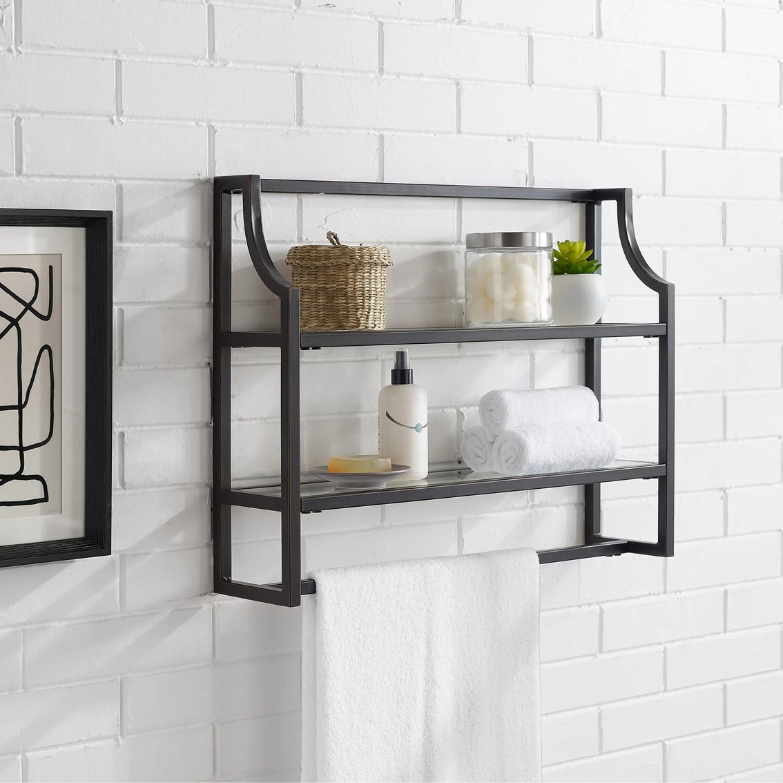 Stylish and modern, Crosley’s Aimee Wall Shelf in oil-rubbed bronze finish is an eye-catching and practical storage solution. Featuring two tempered glass shelves and a towel bar, this wall shelf is perfect for storing bathroom essentials without overwhelming the space. The sculptured steel frame adds visual interest and makes this a great addition to any bathroom. Model: CF6204BZ.