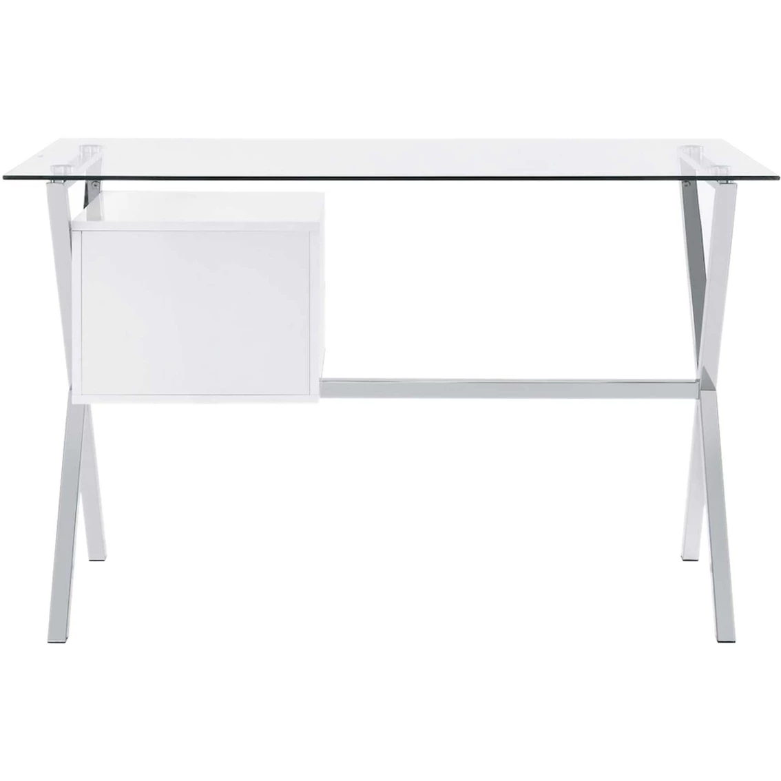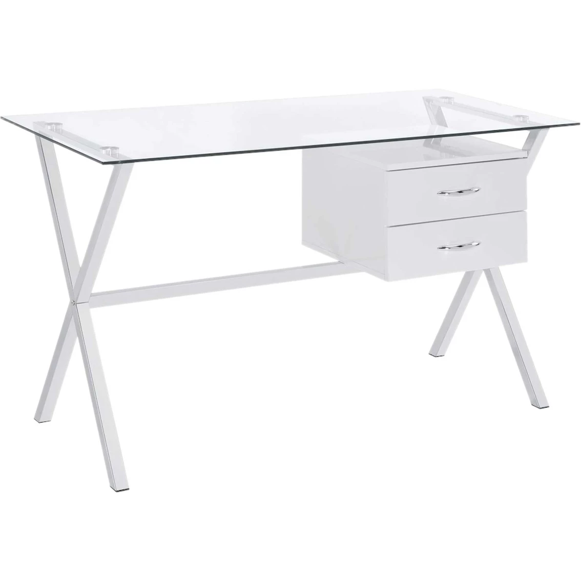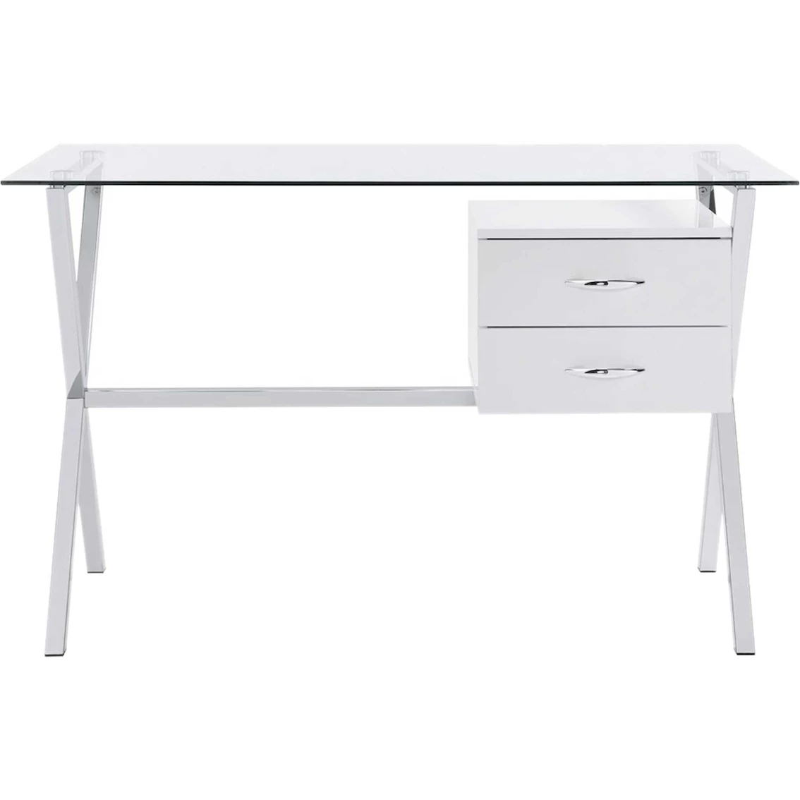 The Elements Ridgeton Desk is designed with simplicity and elegance. Perfect for your modern home. Showcases clear glass and chrome metal. Features great amount of working space and two drawers for storing essentials. This desk is timeless and functional. Model: A.17360.DKE.