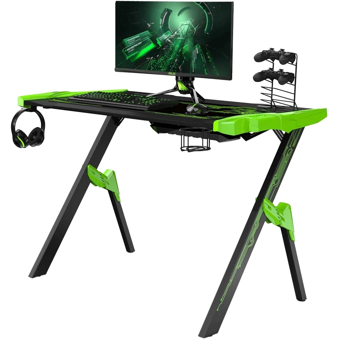 The R-shaped PC Gaming Desk from the Exchange features a large 43.3 in. W x 23.6 in. D gaming surface with a simulated carbon fiber finish. Gamer specific features include: RGB LED lighting, a cup holder and headphone hook, and controller stand that saves desktop space. This gaming table has a power strip that provides two grounded outlets and 3-USB charging ports to keep your accessories powered. The desktop also has a cord management box for organizing your electrical cords and cables. The powder-coated steel frame and R-shaped legs resist scratches and corrosion and supports up to 260 lb.