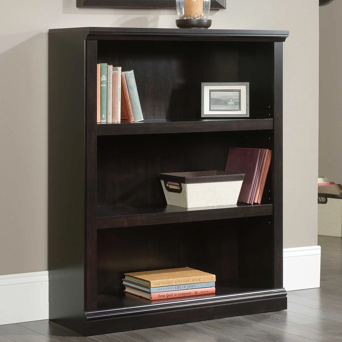 Stylish and functional. This three shelf bookcase from the Sauder Select collection is perfect for stacking, storing, and displaying. It features two adjustable shelves and is finished in a classy Estate Black, making it a versatile fit for any room in your home. Model: 420175.