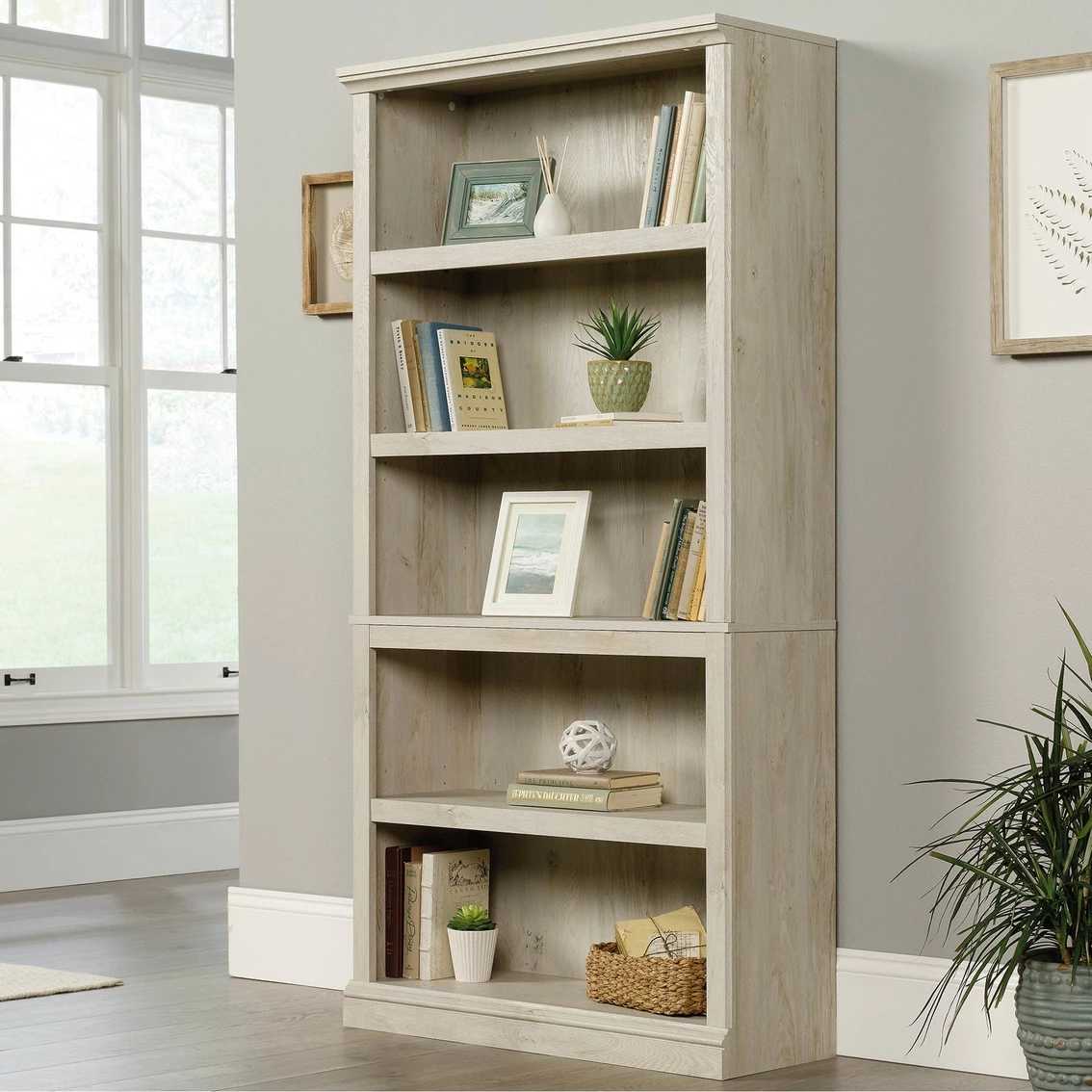 There is no such thing as too much storage space. Add extra storage to your home with this beautiful 5-shelf bookcase from the Sauder Select collection. This tall bookcase features five spacious shelves that offer room for you to store and display anything from your assortment of cookbooks, work binders and bins of office supplies to knick-knacks, decorative plants and photos of your friends and family. Three of the shelves are adjustable so you can modify and move them to the specific height and placement to fit all your needs. This versatile bookcase adds charm and simple style that is sure to stand out in any room of your home – living room, hallway, office or even the bedroom! Finished in Chalked Chestnut, this handsome bookcase is the solution to your storage woes. Model: 423033.
