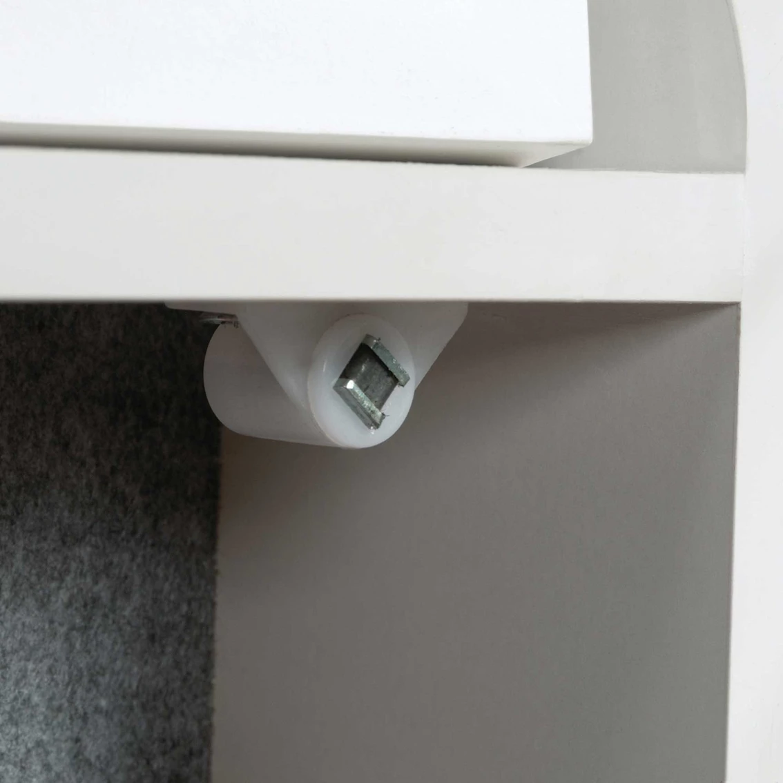 The door of this wall mounted desk flips down to create a spacious work surface that can accommodate your laptop, stacks of notepads, a cup full of pens, and of course your favorite coffee mug. Behind the flip-down door is a gray felt tack board that is perfect for hanging reminders, important papers, and your mail. This space saving desk also includes an upper display shelf for smaller home dรฉcor items and knick-knacks. Finished in Pearl Oak with Blaze Acacia accents, this hanging desk is everything you need and more. Model: 431222.