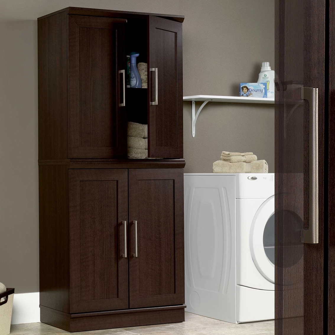 Conquer the clutter in style with this base cabinet from the Sauder HomePlus Collection. It can be stacked up to two high to create a custom storage solution. It features an adjustable shelf behind the framed panel door so you can store towels, dishes or boxes of your favorite cereal. Other features include adjustable base levelers and cord access on the back panel. Finished in a handsome Dakota Oak, this versatile cabinet will have you feeling organized in no time. Model: 411591.