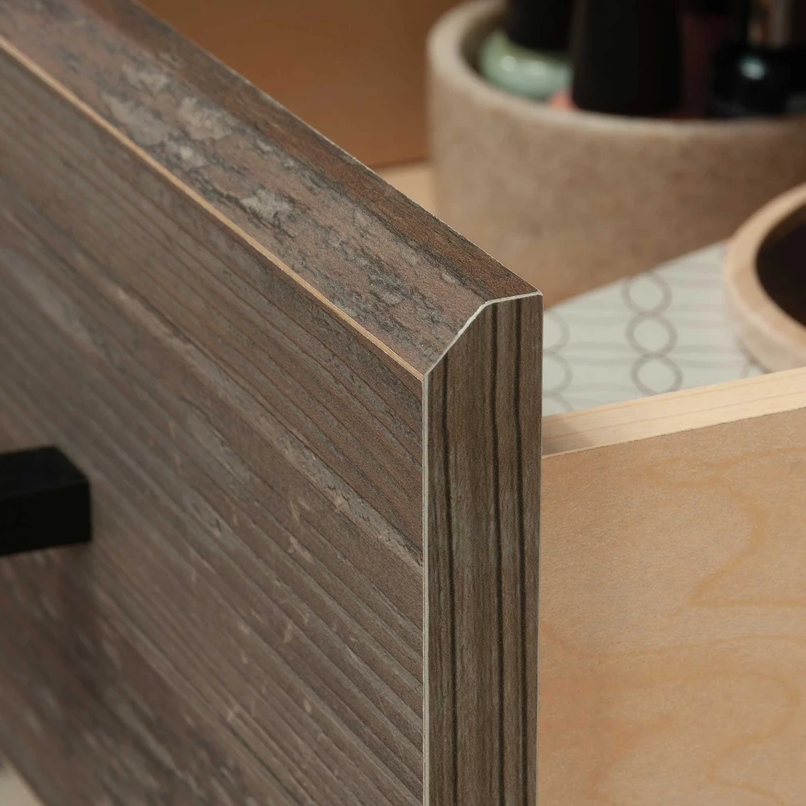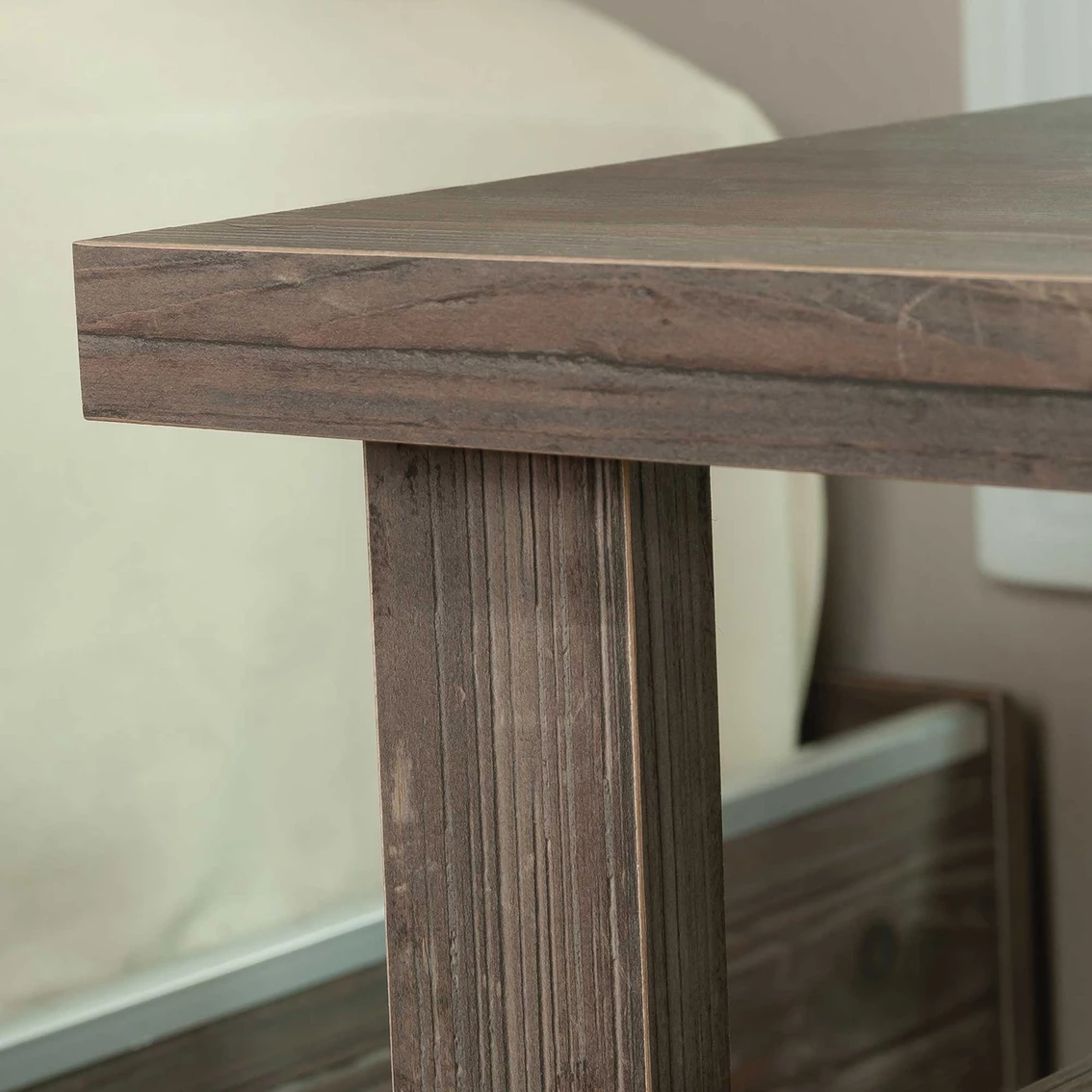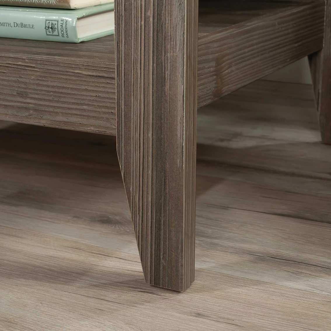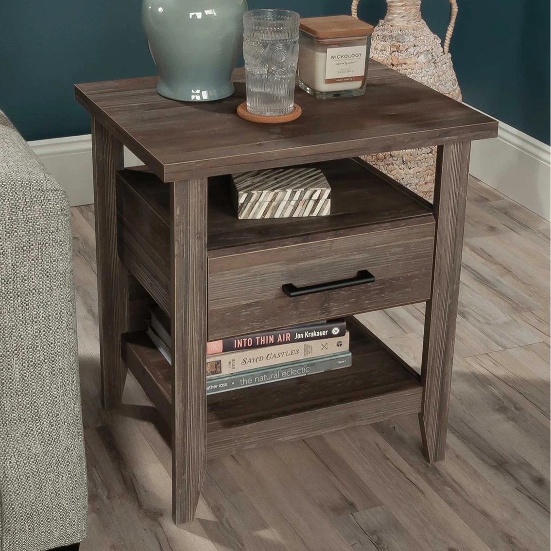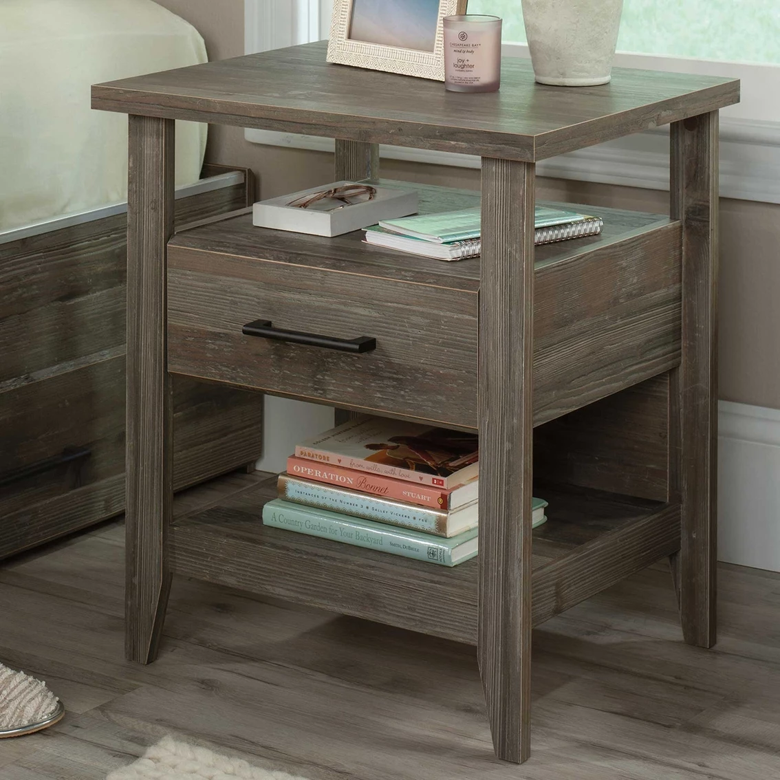 Complete the look of your bedroom with the simplistic charm and universal appeal of this bedside table with drawer from the Sauder Summit Station collection. The spacious top surface of this nightstand with drawer provides you with the perfect amount of space for all your bedside needs — an accent lamp, a glass of water, an alarm clock and a place to charge your smartphone. This nightstand with shelves features a convenient storage drawer that opens and closes on smooth metal runners and is ideal for easy access storage for items like your reading glasses and the TV remote. Two open shelves provide you with additional space for storage and display of other miscellaneous home essentials. Finished on all sides for versatile placement — it looks good no matter where is stands. Finished in Pebble Pine with tapered feet and chamfered edges. Model: 431747.