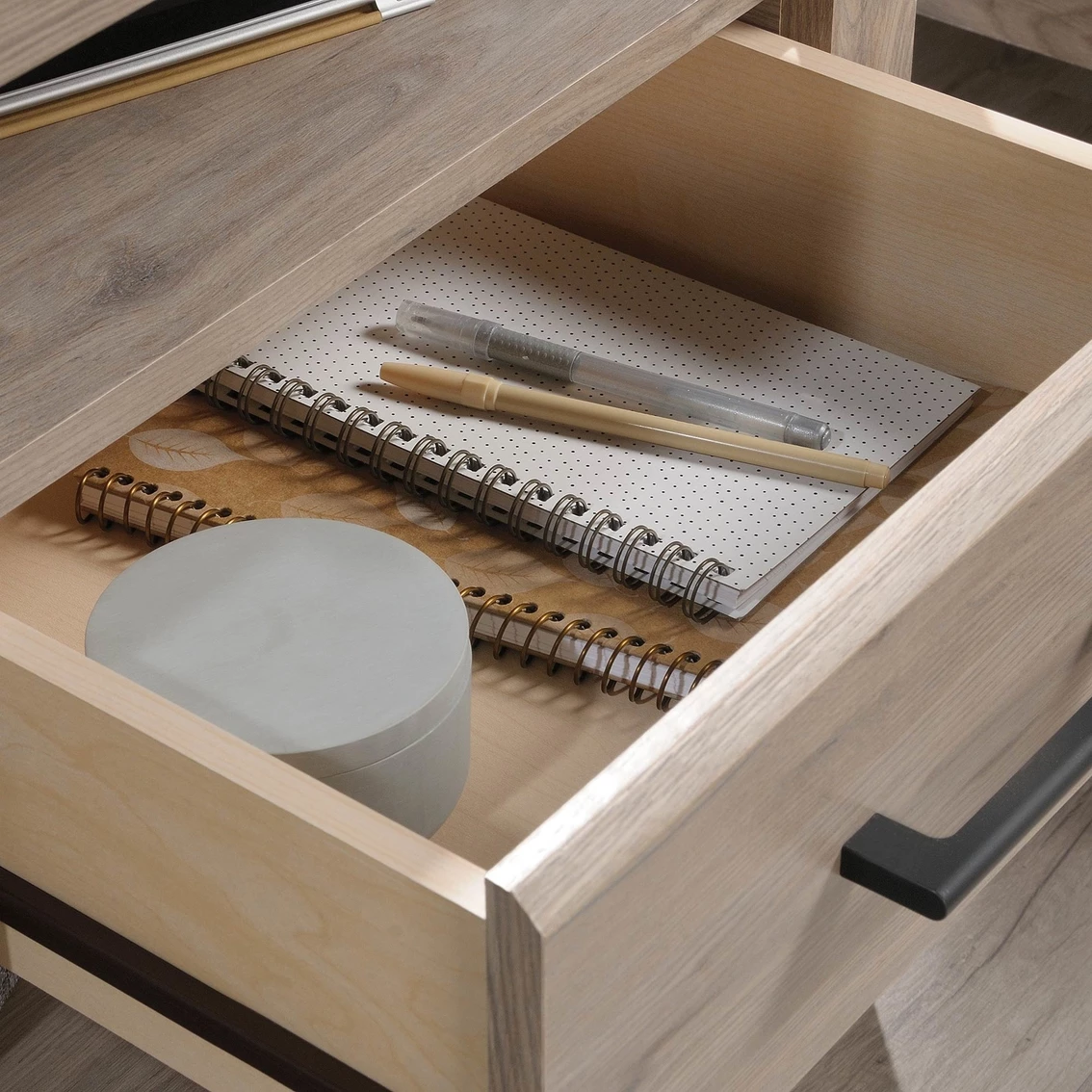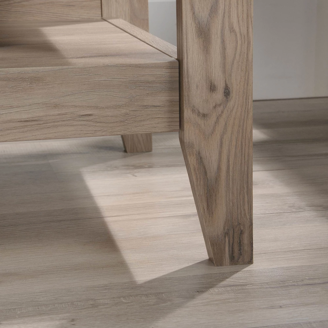 The perfect nightstand does exist. Give your bedroom the upgrade it deserves when you add the charming good looks and functional design of this night stand from the Sauder Summit Station collection. This bedside table offers a spacious top surface that provides you with room for items like an accent lamp, a picture frame, your alarm clock and a cup of water. The storage drawer opens and closes on smooth metal runners for convenient storage of items like your reading glasses and the TV remote. The two open shelves provide additional storage space for other miscellaneous bedroom items. Nightstand is finished in Laurel Oak on all sides for versatile placement throughout your home. Detailed with tapered feet and chamfered edges, this nightstand will transform the look of your bedroom.