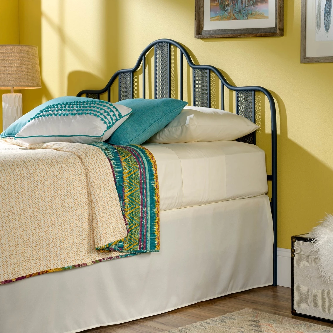 Snooze in style with this queen headboard from the Viabella collection. It features a geometric perforated pattern that adds a simple yet detailed design to your bedroom. Constructed from powder-coated metal with a Navy Blue finish, this headboard will have your queen-sized bed looking stylish and even more tempting to nap in. Add the matching footboard (sold separately, model 420102) to complete the set. Model: 420101.
