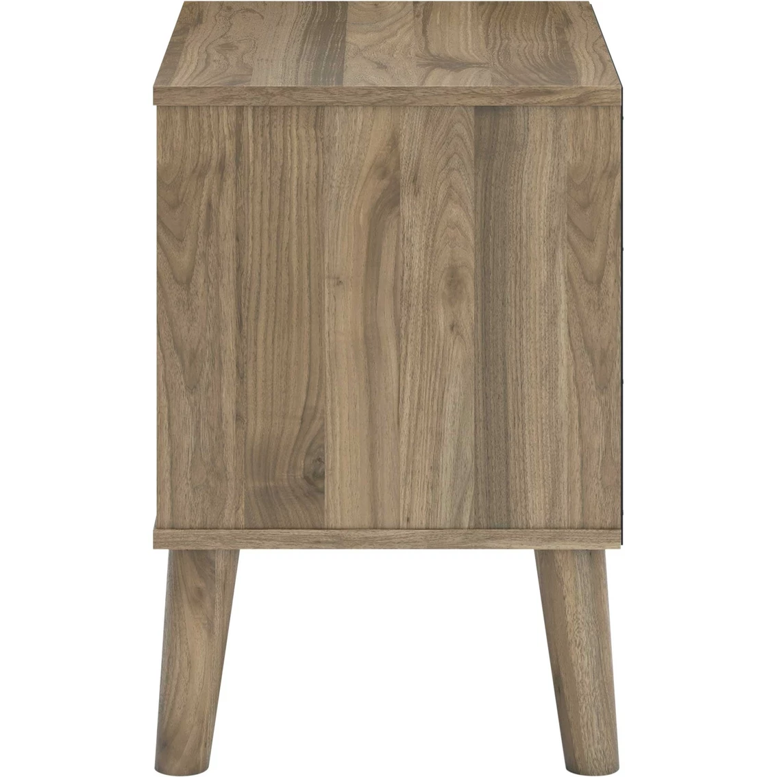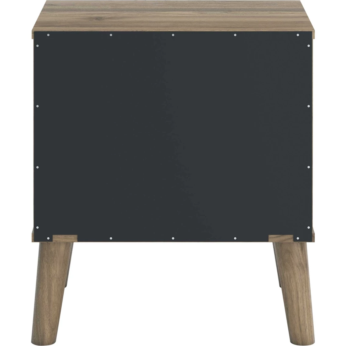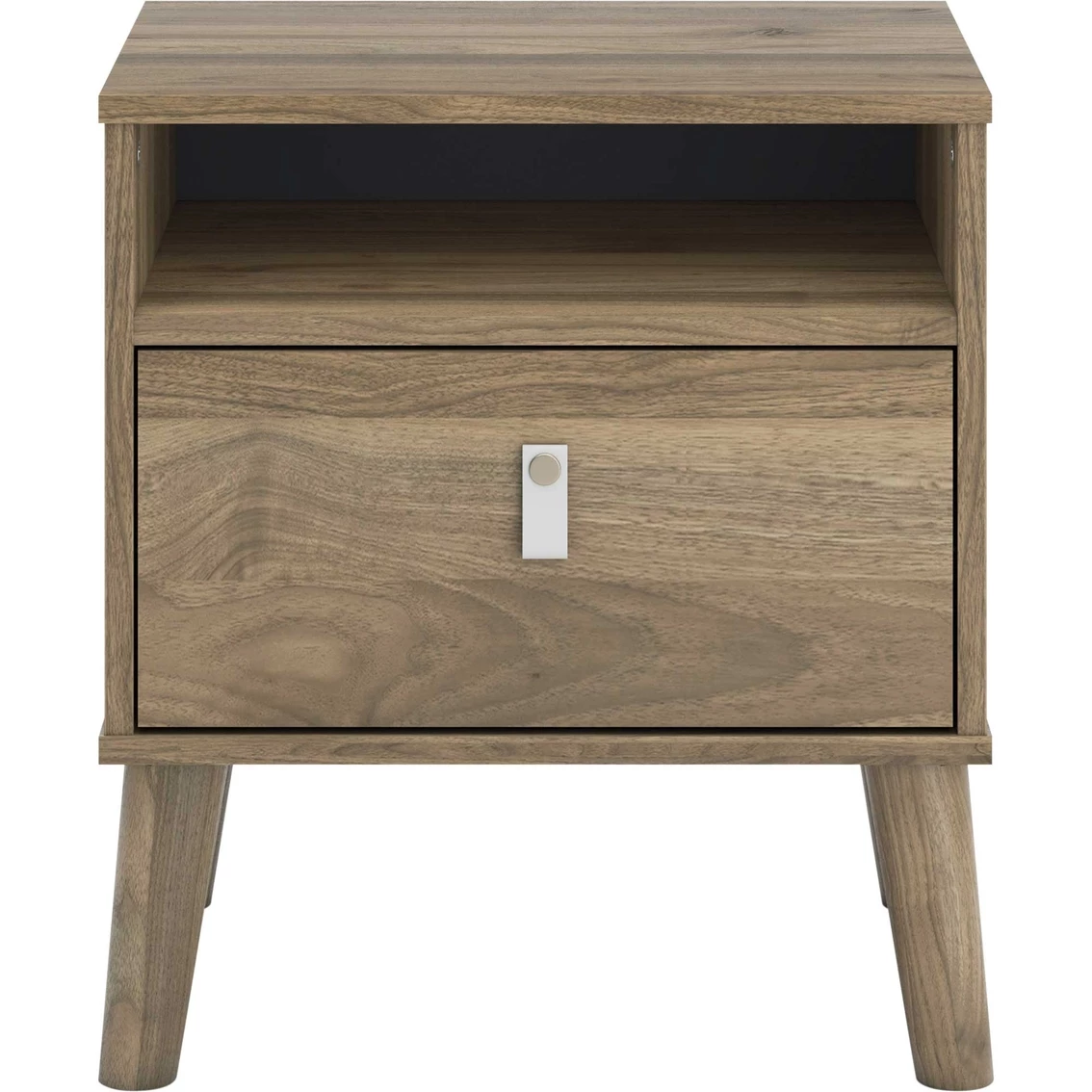 Dare to take minimalism to the max. The Aprilyn Ready to Assemble nightstand from Signature Design by Ashley has a richly relaxed feel thanks to its honey brown finish over replicated wood grain. Magnificently mod splay legs are a compelling complement to the streamlined design. And with two different faux leather drawer pulls that allow you to customize the nightstand to suit your space, there’s no doubt about it: This contemporary piece is sure to become a classic. Made with engineered wood (MDF/particleboard) and decorative laminate. Rich honey brown finish over replicated walnut grain with authentic touch. Faux leather drawer pull with brass-tone rivets; light brown and gray options included. One smooth-gliding drawer with vinyl-wrapped sides and back. Open cubby. Splay legs. Featured item is nightstand only; images show options. Assembly required. Ships in one carton. Model: EB1187-291.