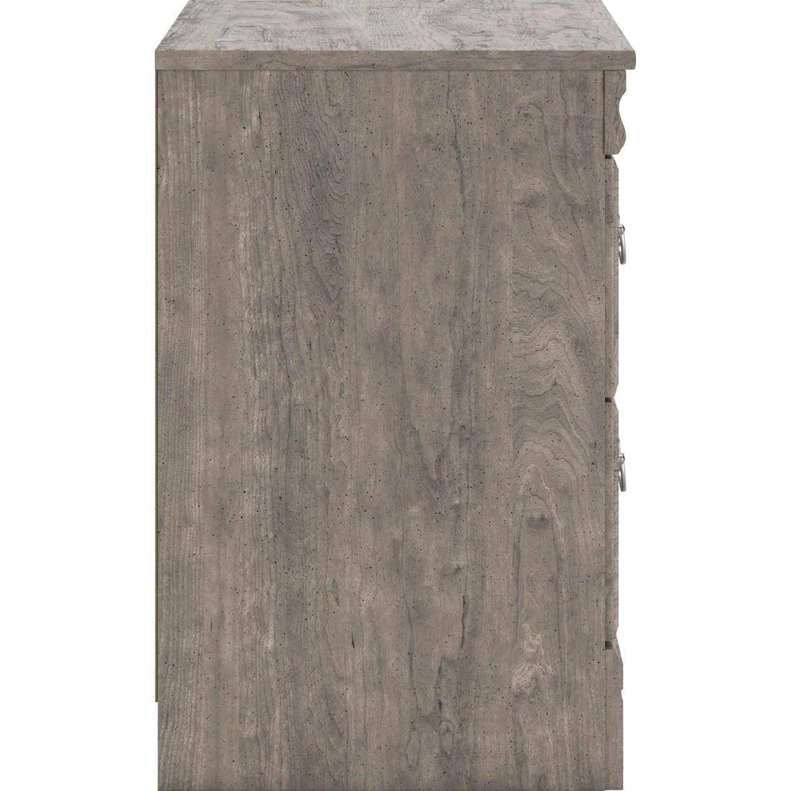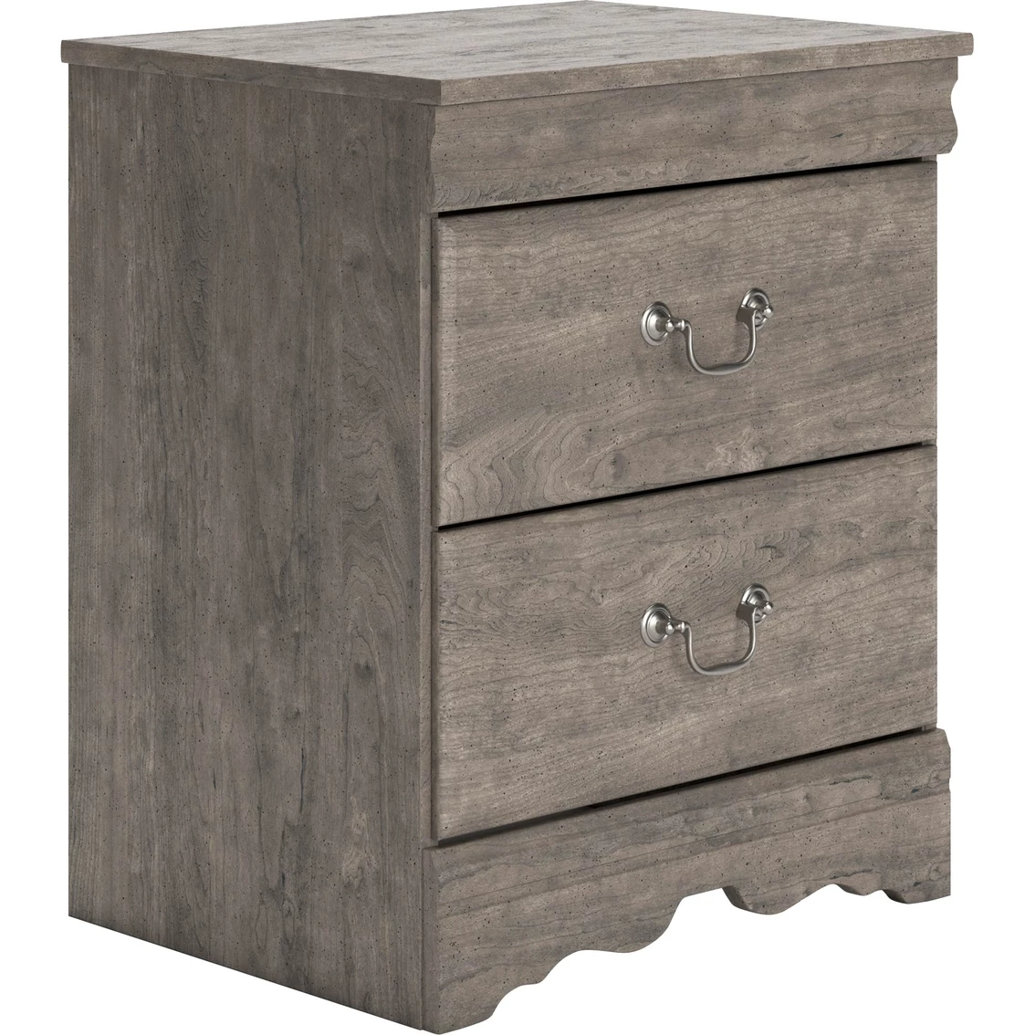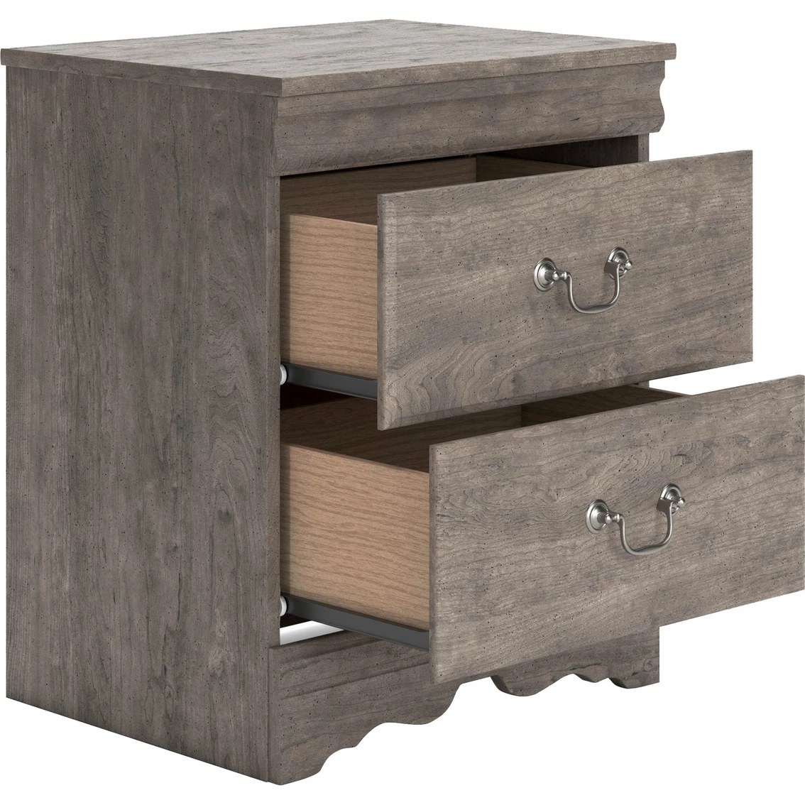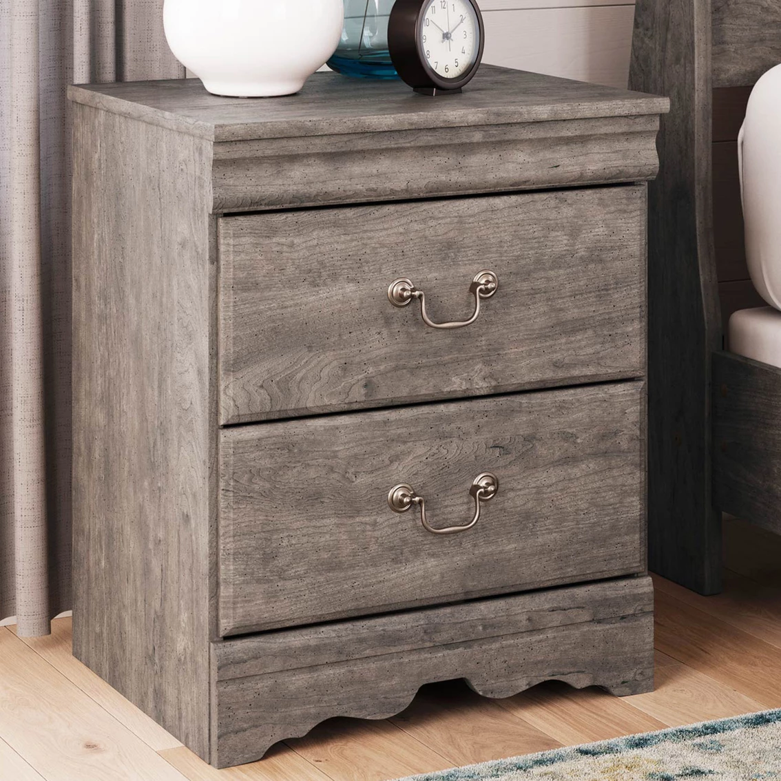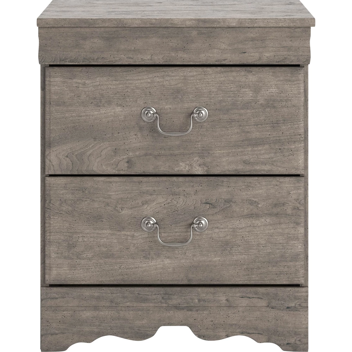 For those who appreciate a traditional aesthetic with understated elegance, the Bayzor nightstand from Signature Design by Ashley brings home a dreamy look priced to put you at ease. Its warm gray vintage finish with subtle pearl effect is paired with antiqued pewter-tone drawer pulls for richly classic appeal. The nightstand features two smooth-gliding drawers. Featured item is nightstand only; images show options. Assembly required. Model: B1126-92.