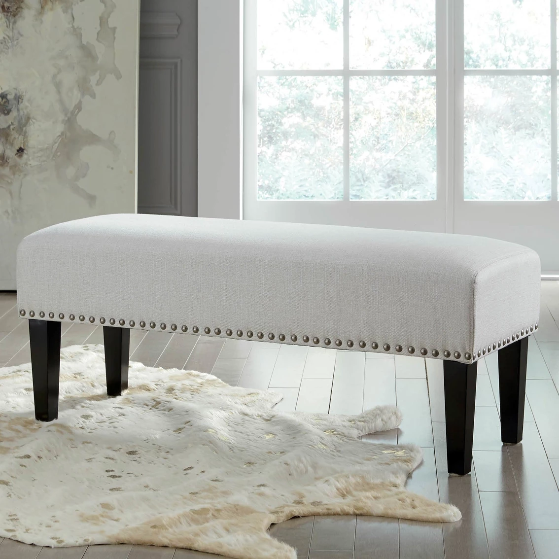 The Signature Design by Ashley Beauland Accent Bench is the accent piece your home deserves. The bench is upholstered in a gorgeous textured fabric. Features tufted seat back and tight seat cushion with webbing construction. Includes rubber wood legs and a dark finish. Model: A3000117.