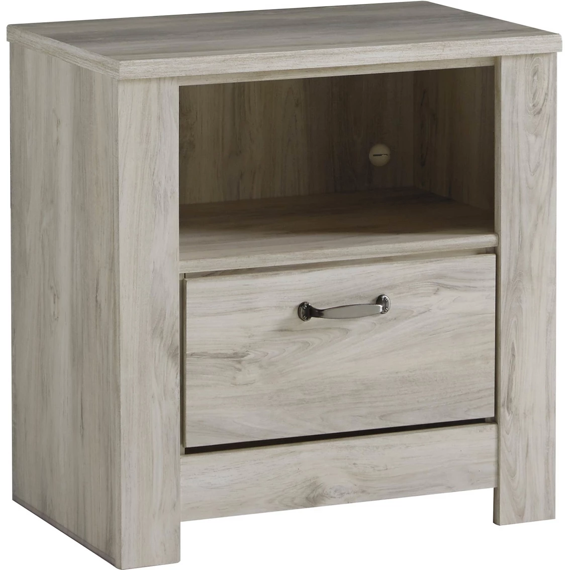 Your bedroom isn’t just a room. It’s a canvas. Express your farmhouse style with the Bellaby 1-Drawer Nightstand from Signature Design by Ashley. Wispy white finish over replicated oak wood grain brightens up the space with charm. Brushed nickel-tone handle with black edging finesse the piece with a bit of shine. Drawer is spacious and lined with faux linen laminate to hold your belongings with care. This clean-lined profile is the perfect authentic foundation for inviting decor. Dresser only; mirror not included.lt/brgt/lt/brgt/lt/ul class=”long-desc”gt/lt/ligt/Wispy white finish over replicated oak grain with authentic touchlt//ligt/lt/ligt/Handle in a brushed nickel color finish with black hang uplt//ligt/lt/ligt/Slim USB charger located on the back of the night stand topslt//ligt/lt/ligt/Side roller glides for smooth operating drawerlt//ligt/lt/ligt/Drawer interior is lined with a faux linen laminate for a clean, finished looklt//ligt/lt/ligt/Model: B331-91lt//ligt/lt//ulgt/