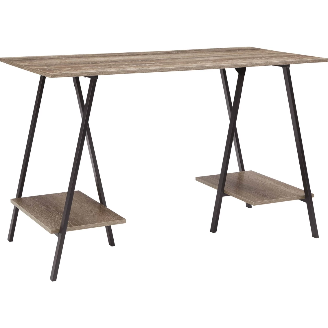 A scaled-down take on the simply striking Bertmond sawhorse table, this desk works beautifully for those short on space. Hairpin style metal legs combined with engineered wood shelves beautified with a grayish brown decorative wood grain laminate make a brilliant statement. Featured item is desk only; images show options. Model: H300-310.