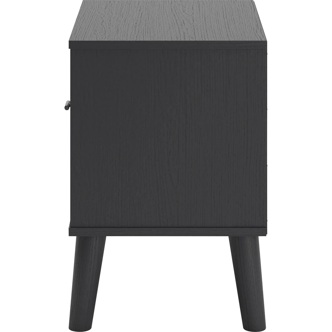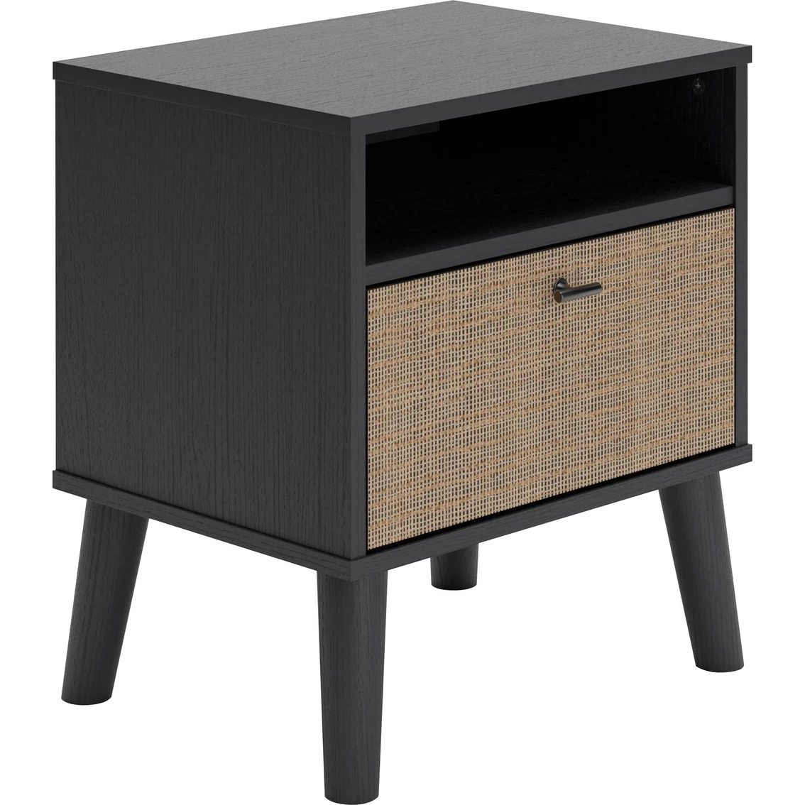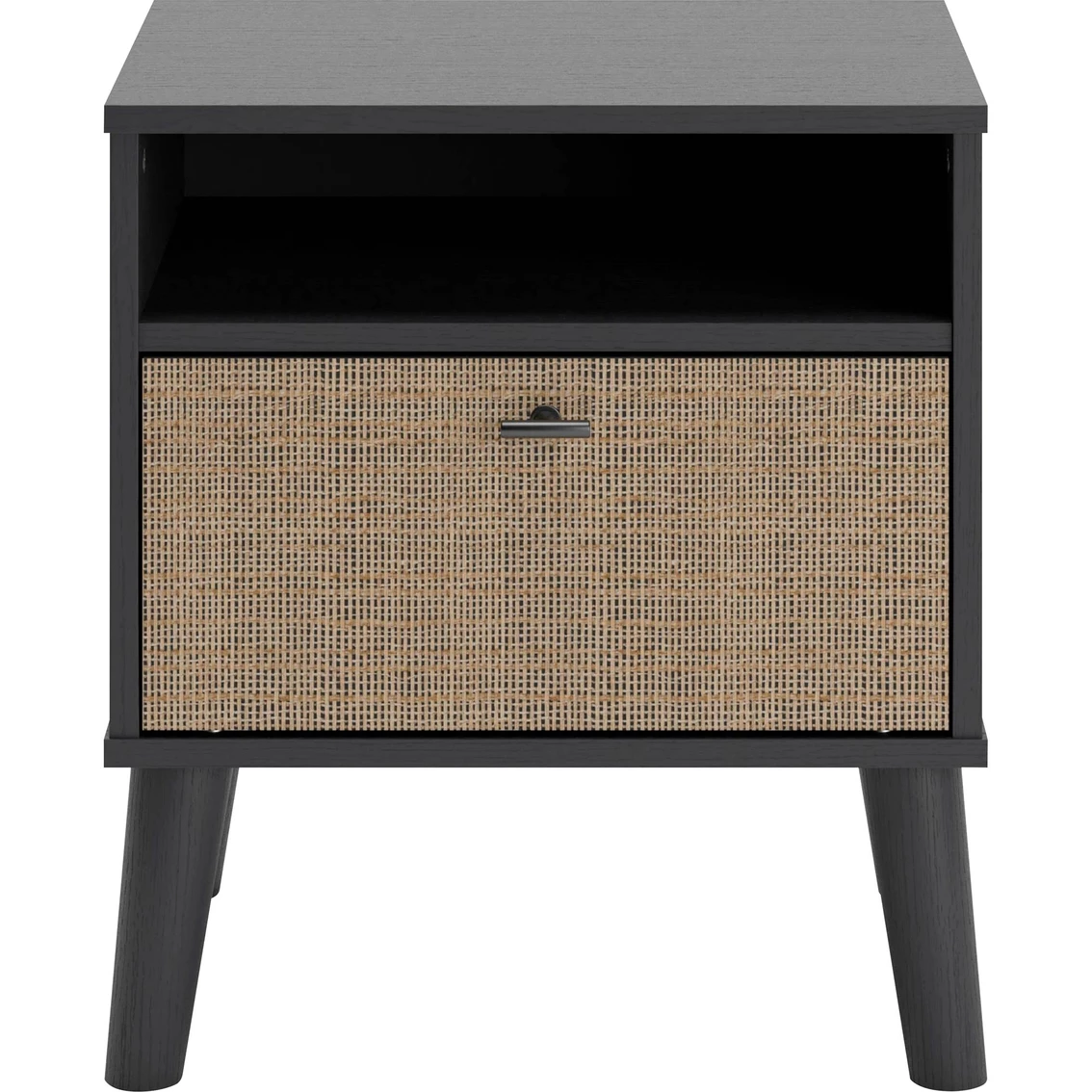 Put a retro spin on current trends with the Charlang Ready to Assemble nightstand from Signature Design by Ashley. Its mixed-material look of matte black and replicated beige cane brings a casually cool feel to your bedroom. Simple, sleek hardware and splay legs round out the urban meets mid-century vibe. Made with engineered wood (MDF/particleboard) and decorative laminate. Matte black finish with subtle replicated wood grain. Drawer front with replicated beige cane finish. Matte black knob. Smooth-gliding drawer with vinyl-wrapped sides and back. Open shelving. Splay legs. Featured item is nightstand only; images show options. Ships in one carton. Assembly required. Model: EB1198-291.