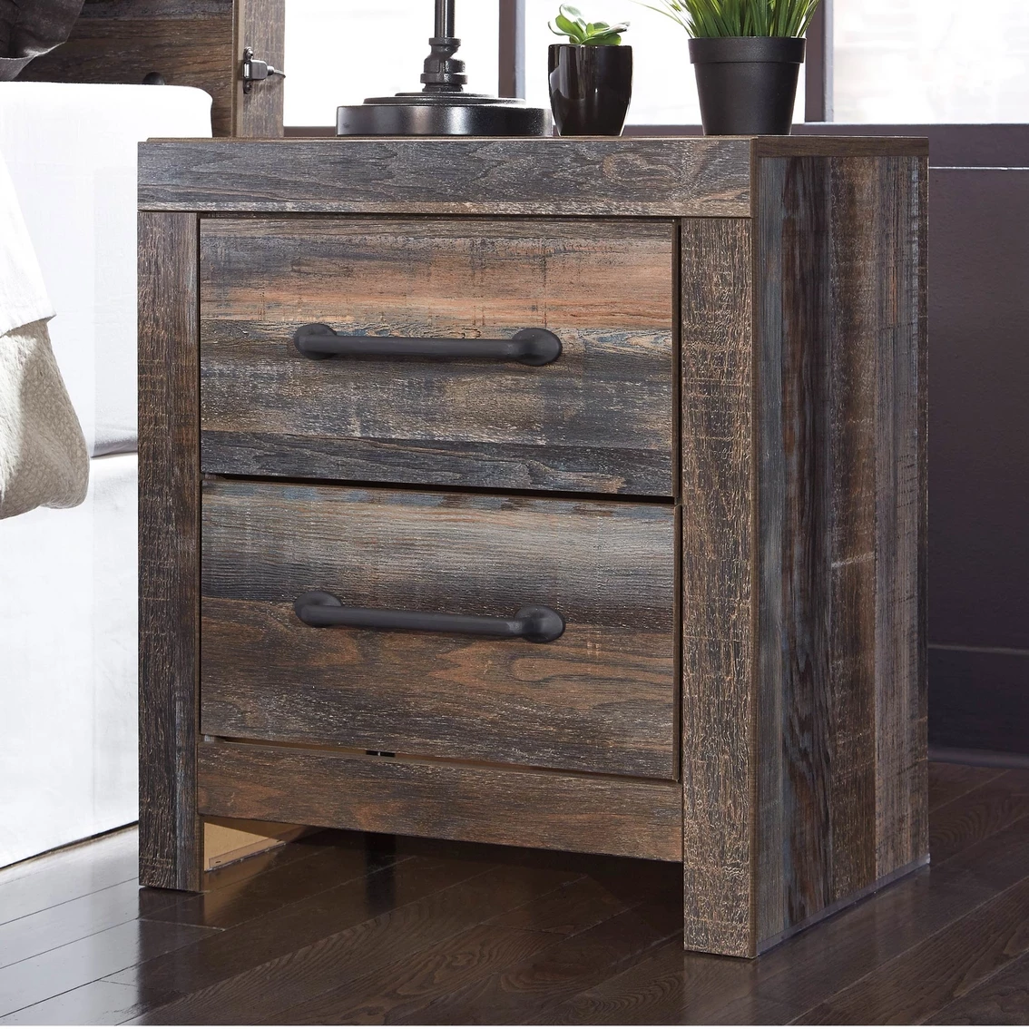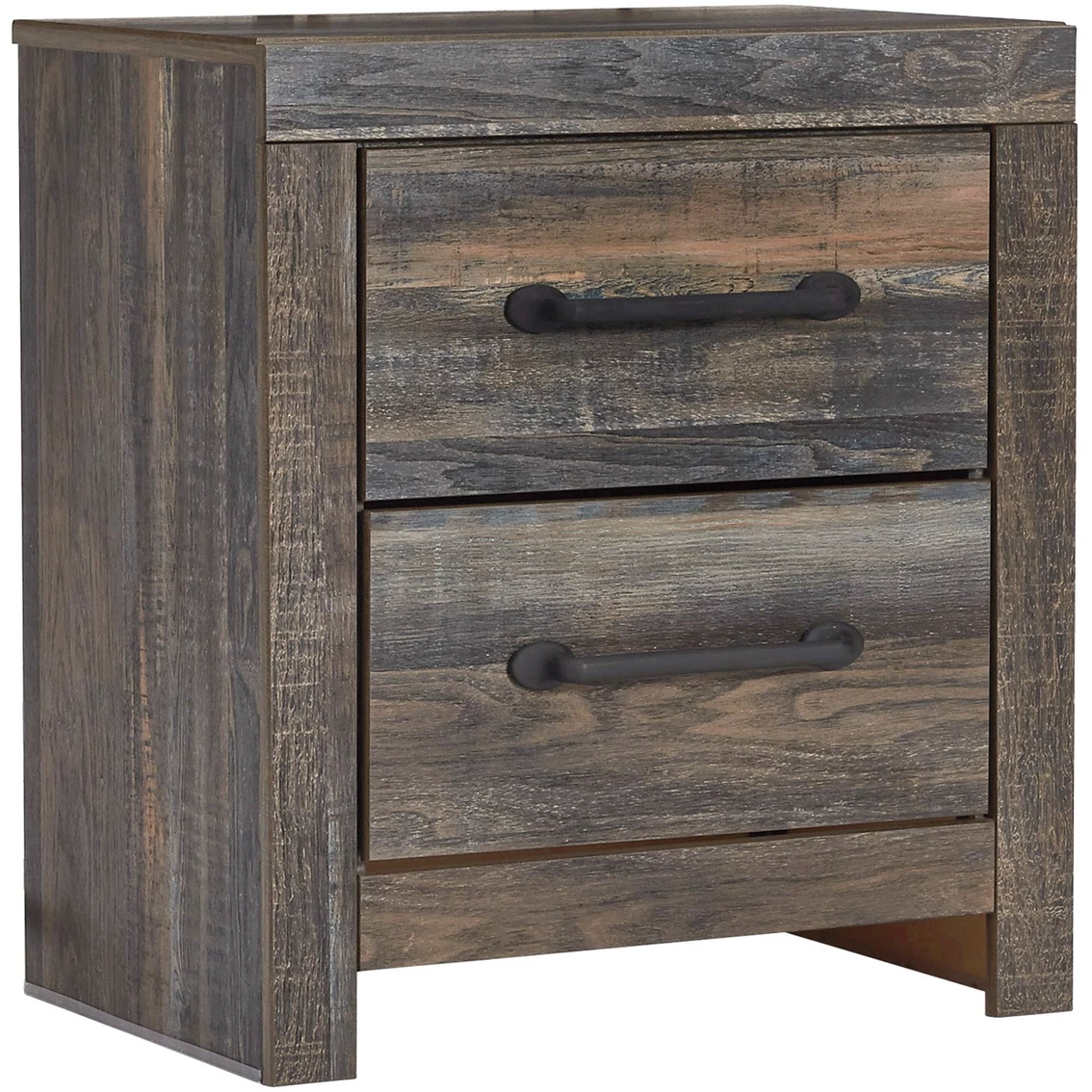 When merged in just the right way, rustic and industrial styles can make one happy marriage with this Drystan 2-Drawer Nightstand from Signature Design by Ashley. Crafted with a refined take on barn board beauty, its complex, replicated wood grain showcases hints of burnt orange and teal tones for a sense of weatherworn authenticity. Elongated metal drawer pulls elevate the aesthetic. Inclusion of USB plug-ins is such a bright idea. Featured item is nightstand only. Model: B211-92.