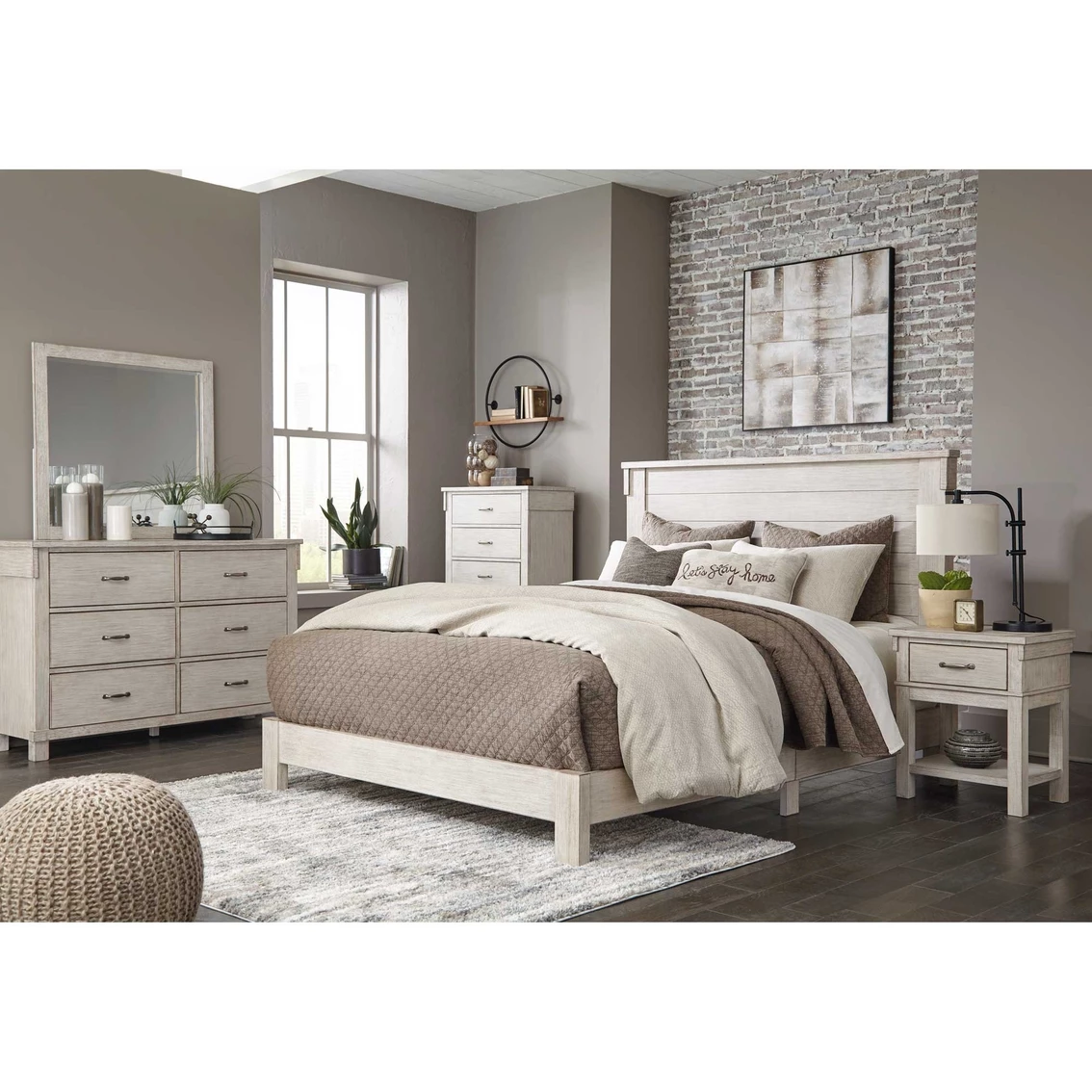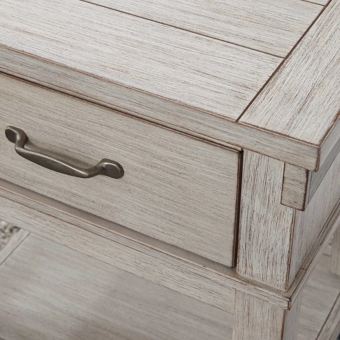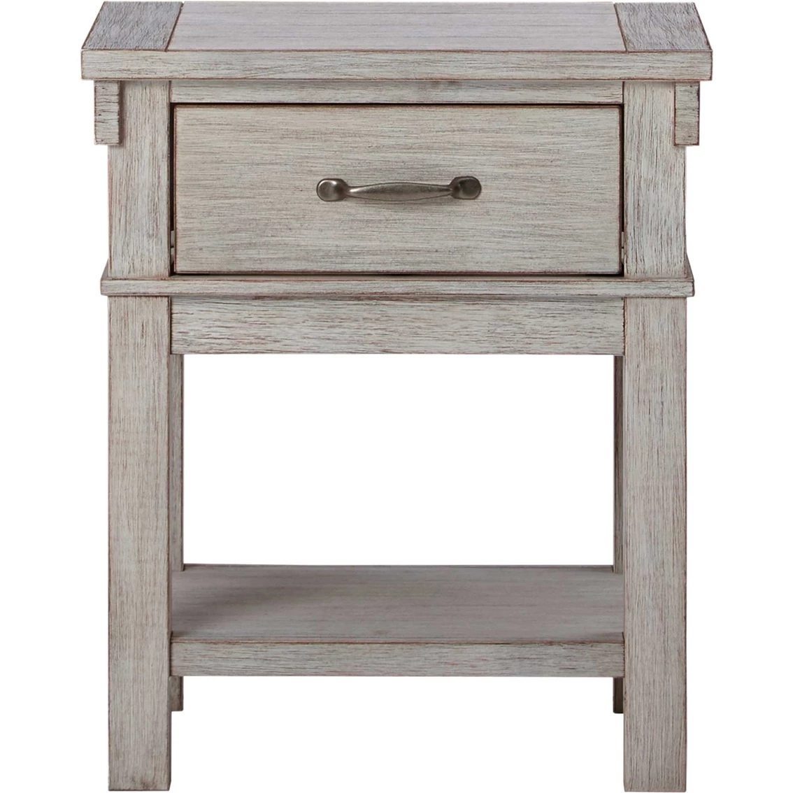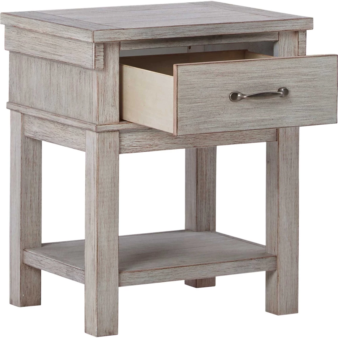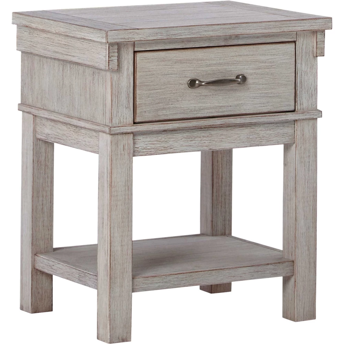 Casual lifestyle design is brought to life in the Hollentown 1-Drawer Nightstand from Signature Design by Ashley. Made with solid wood frames, engineered veneer with engineered wood substrates and rubbed white finish with a complex blend of rich texture and woody undertones. Drawers feature a dovetailed drawer construction with metal center guides and softly shaped bar pulls in a brushed nickel color finish. Model: B434-91.