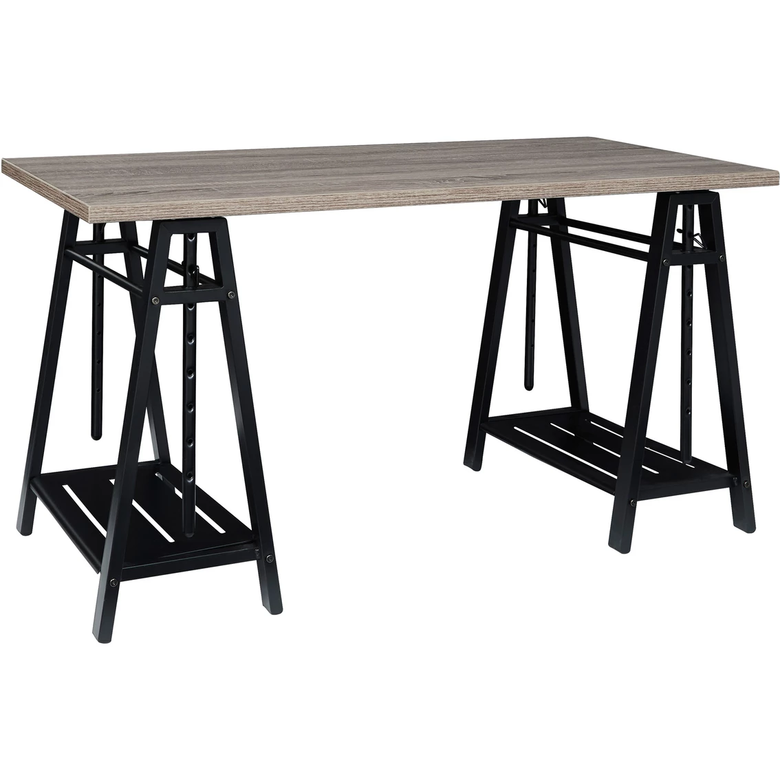 A look thatβs sure to work wonders in your modern farmhouse, the Irene sawhorse adjustable height desk from Signature Design by Ashley is right on trend. Reclaimed finished top and industrial gray metal base make a cool combination. Whether you’re sitting, standing, typing or crafting, you’re sure to love the desk’s unique 8-level adjustable height feature. Assembly required; instructions included for ease of assembly. Model: Z1430261.