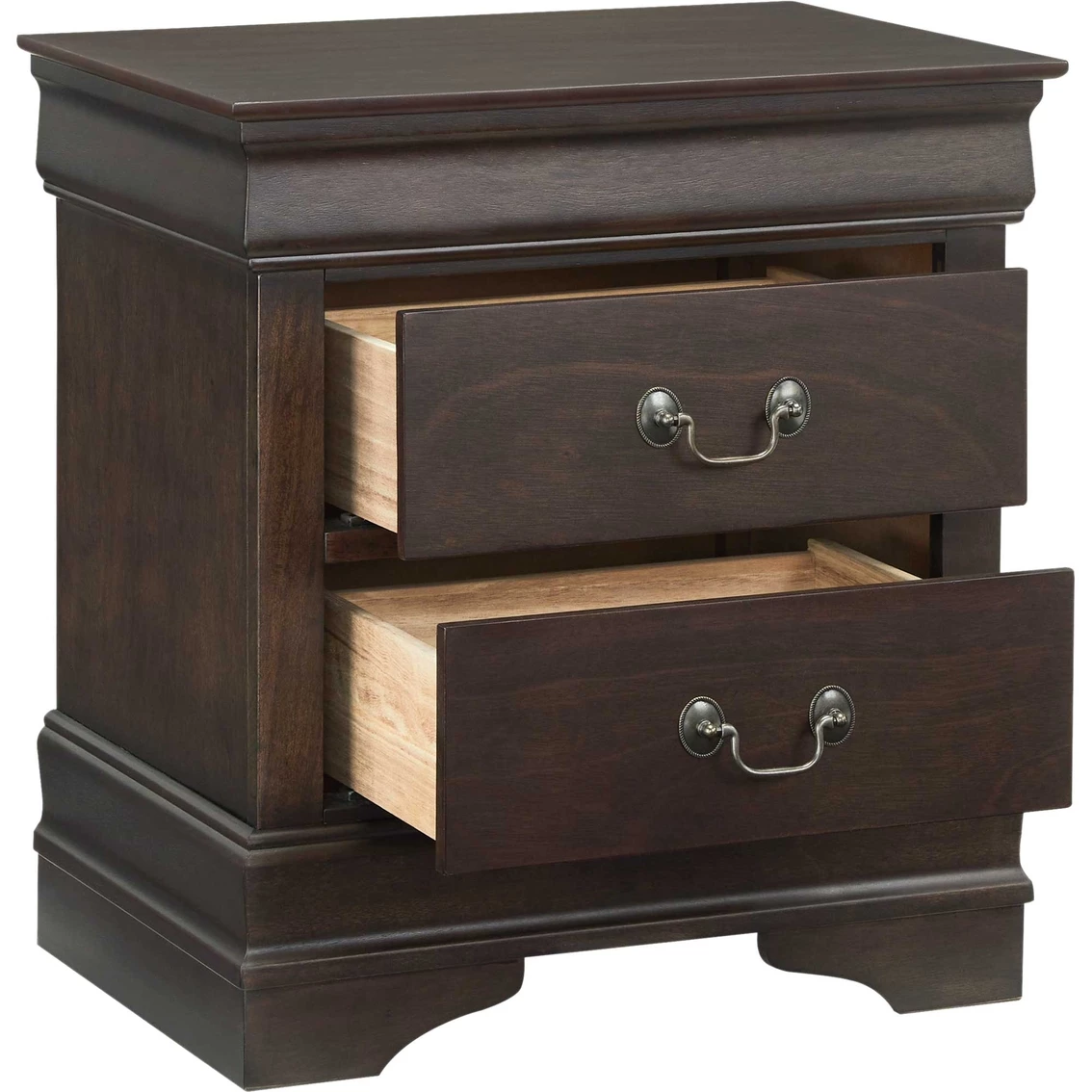 Polished and poised in an elegant deep brown finish, the Leewarden nightstand is a regal dream in traditional Louis Phillippe styling. Two drawers with dovetail construction provide sophisticated bedside storage. An additional elegant touch is provided by the antiqued bronze-tone drawer pulls. Featured item is nightstand only; images show options.