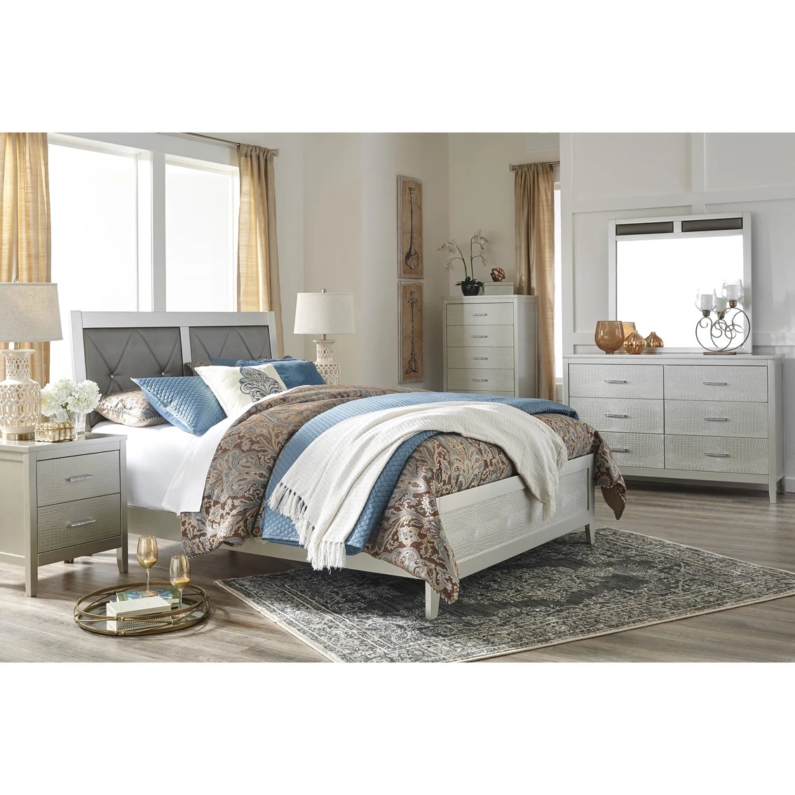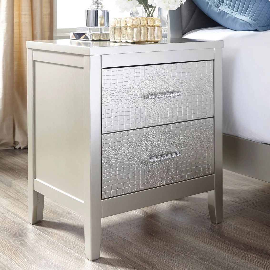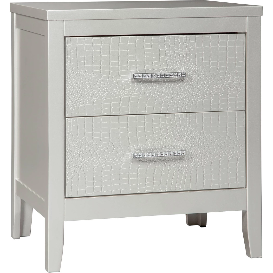 A touch of Old Hollywood reserved for the high-fashion starlet. Stealing the show with its glamorous good looks and upscale attitude, the Signature Design by Ashley Olivet Two Drawer Nightstand is red carpet style made affordable. Embossed textural drawer fronts and footboard panel have a modern “Glam” look. The metal center guides drawers with paper wrapped boxes. Bar pulls with inset faux crystal arrangement. Model: B560-92.