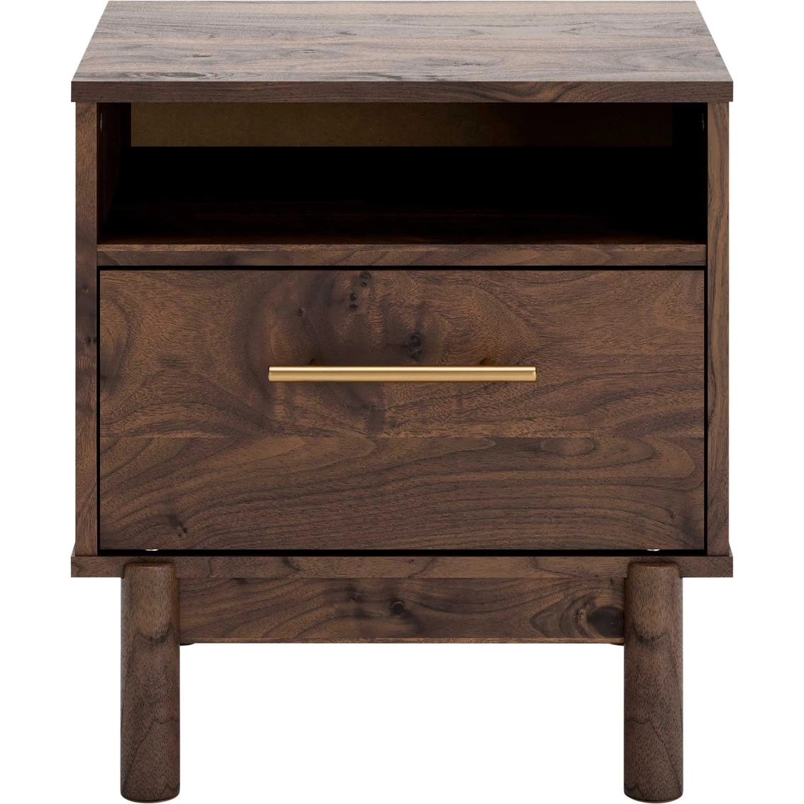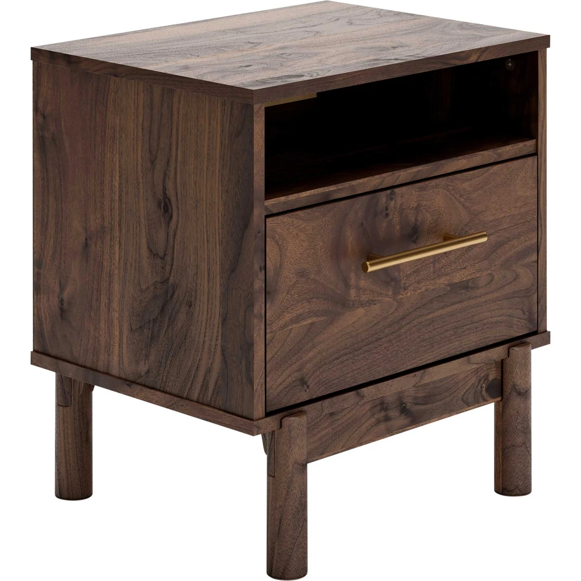 At the intersection of industrial cool and chic sophistication, you’ll find this Ready To Assemble Calverson nightstand from Signature Design by Ashley. With a rich brown finish over replicated walnut wood grain, paired with burnished goldtone handles, it offers an authentic touch that plays well any way you style it. Simple and elegant in its design, this piece keeps your home decor grounded while elevating your modern style. One smooth-gliding drawer with vinyl-wrapped sides and back and convenient open cubby space for personal items. Featured item is RTA nightstand only; images show options. Assembly required. Ships in 1 carton. Model: EB3660-291.