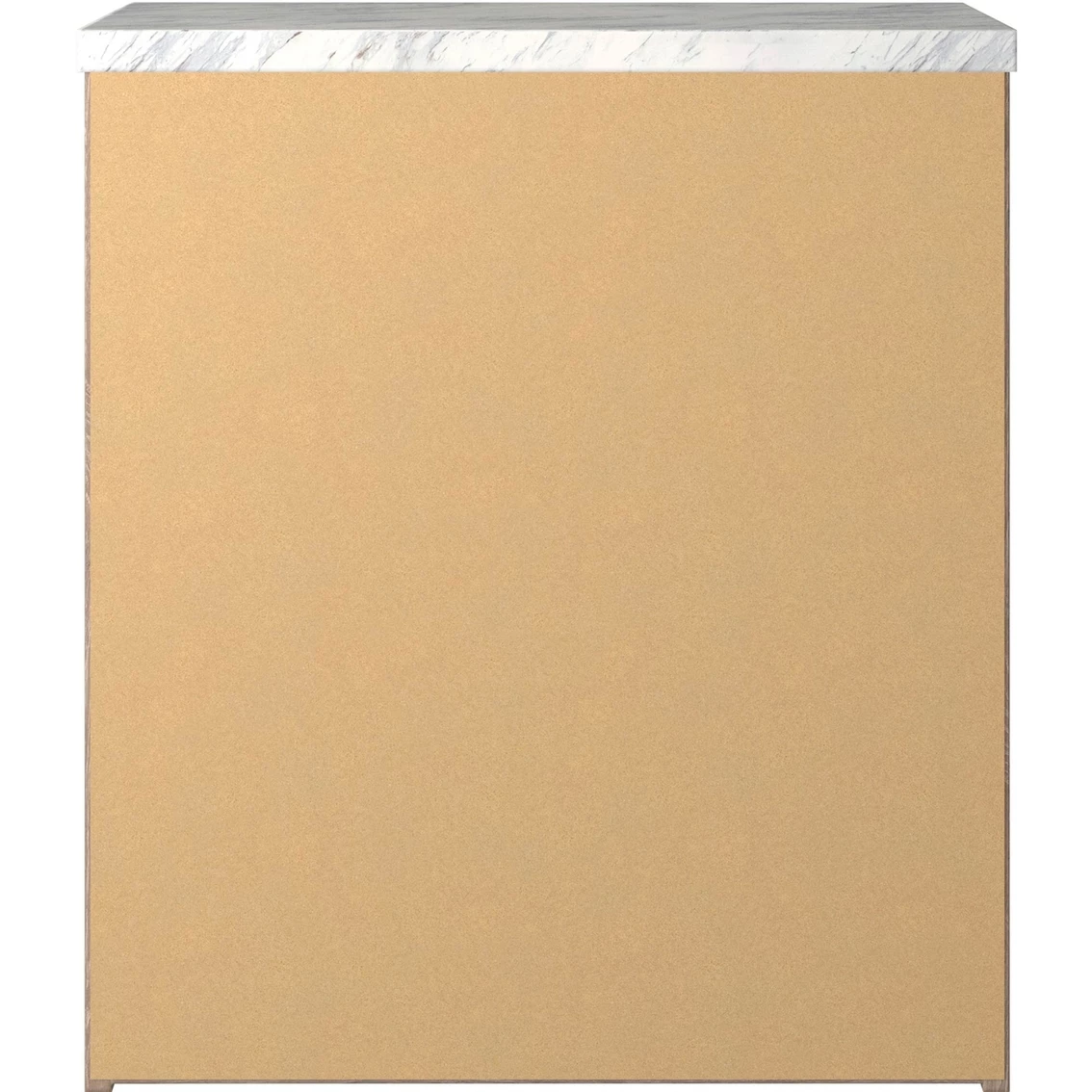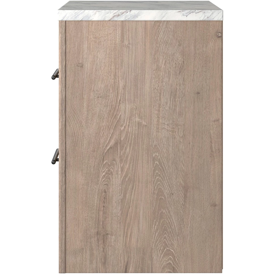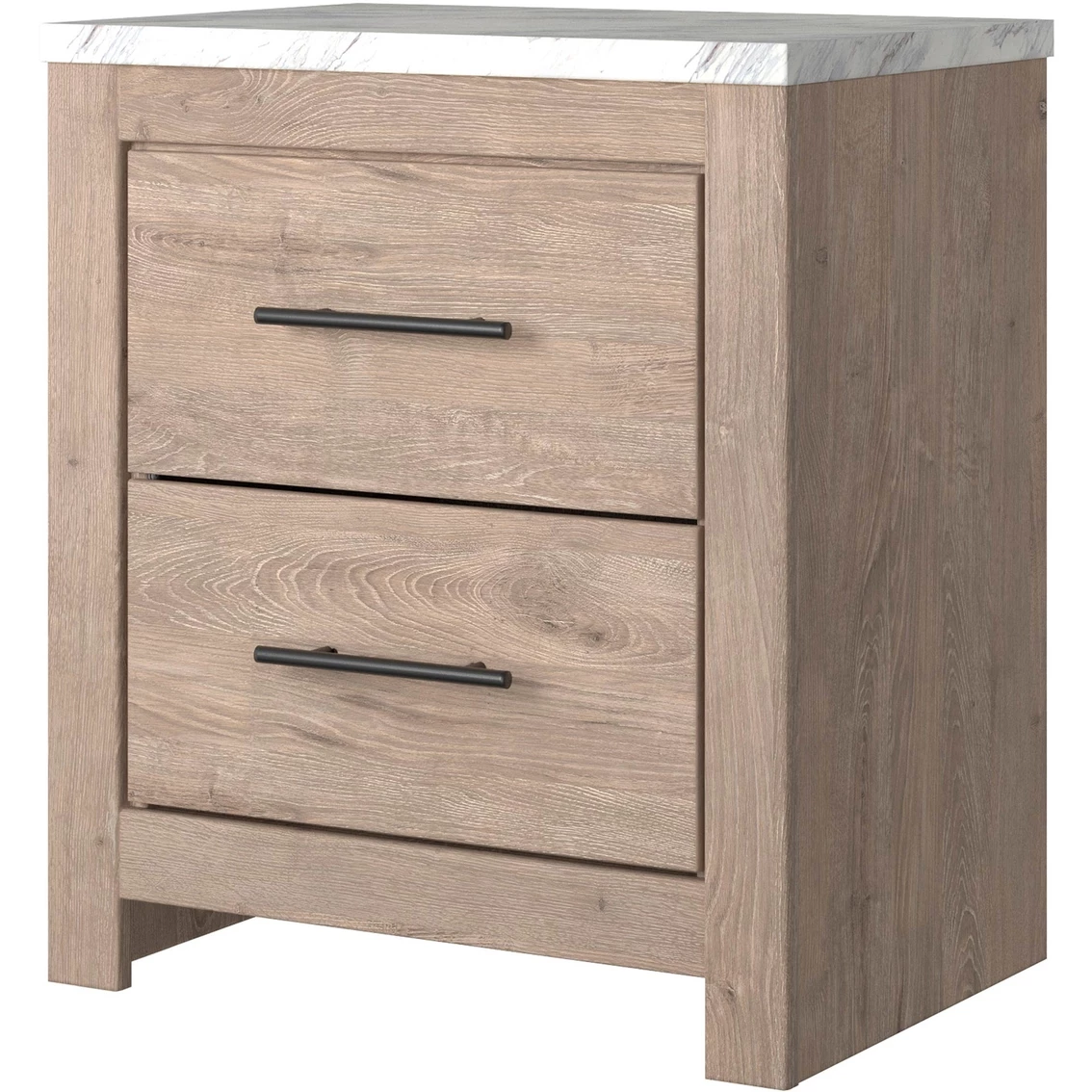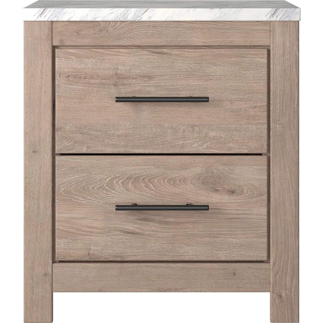 Cool, clean and casually modern. The Signature Design by Ashley Senniberg nightstand’s light natural finish and faux Calcutta marble top set the tone for your calming sanctuary. Large linear pulls add dimension and authenticity. Two smooth-gliding drawers neatly accommodate your bedside needs. Featured item is nightstand only; images show options.