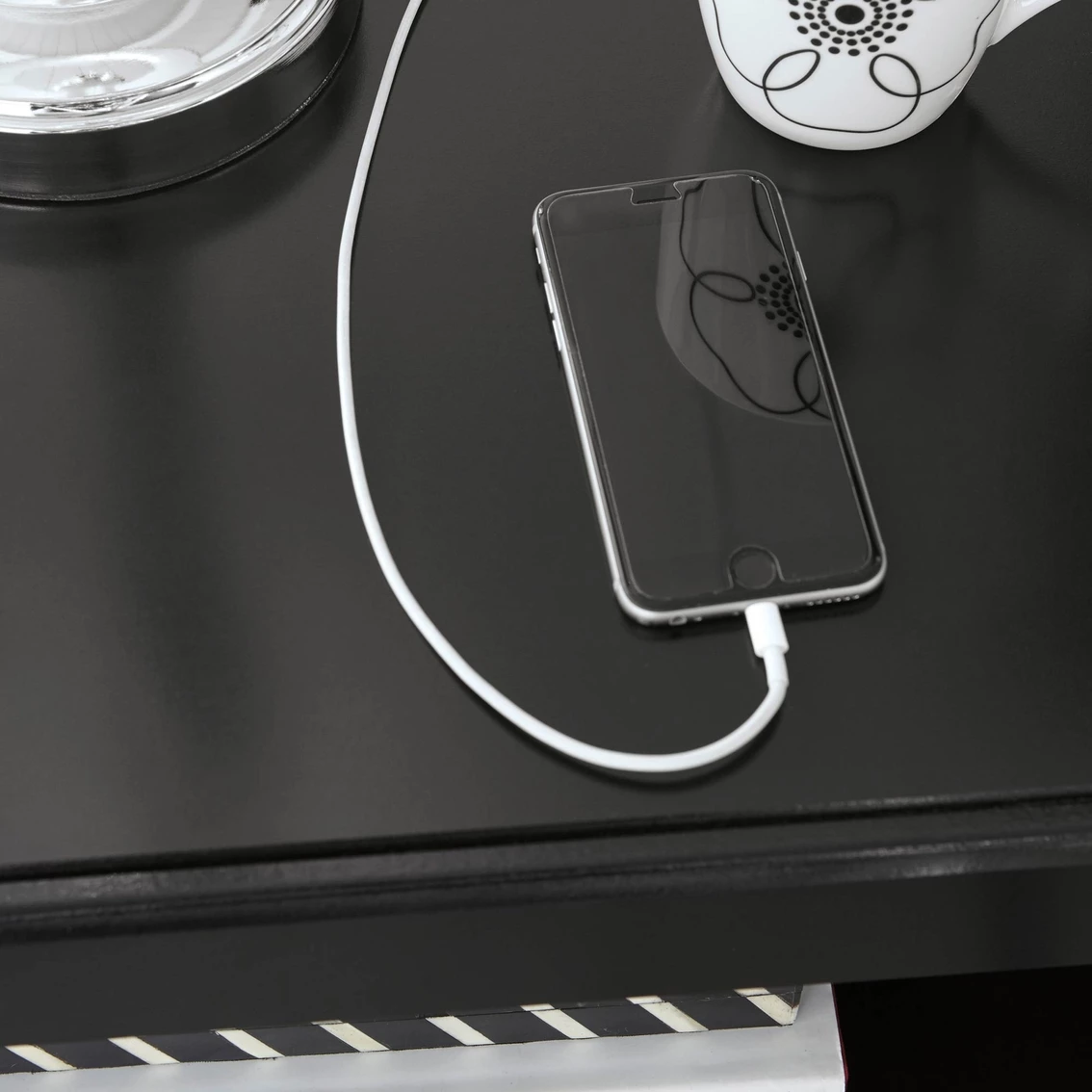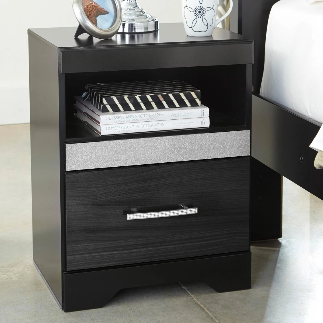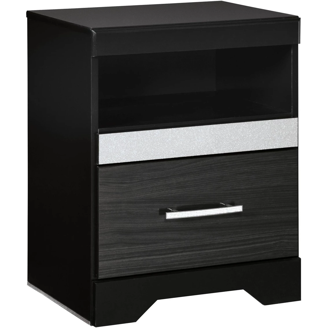 The Signature Design by Ashley Starberry Night Stand has a stunning gloss finish with replicated straight walnut grain. Inspired by Hollywood glam, the richly styled nightstand steals the show in a simply stunning way. The nightstand’s replicated walnut grain is enriched with a high-gloss finish, made even more dramatic with a strip of sleek glitter banding that accentuates a clean-lined, contemporary aesthetic. A discreetly positioned USB charging station makes it all the more accommodating. Featured item is night stand only. Model: B304-91.