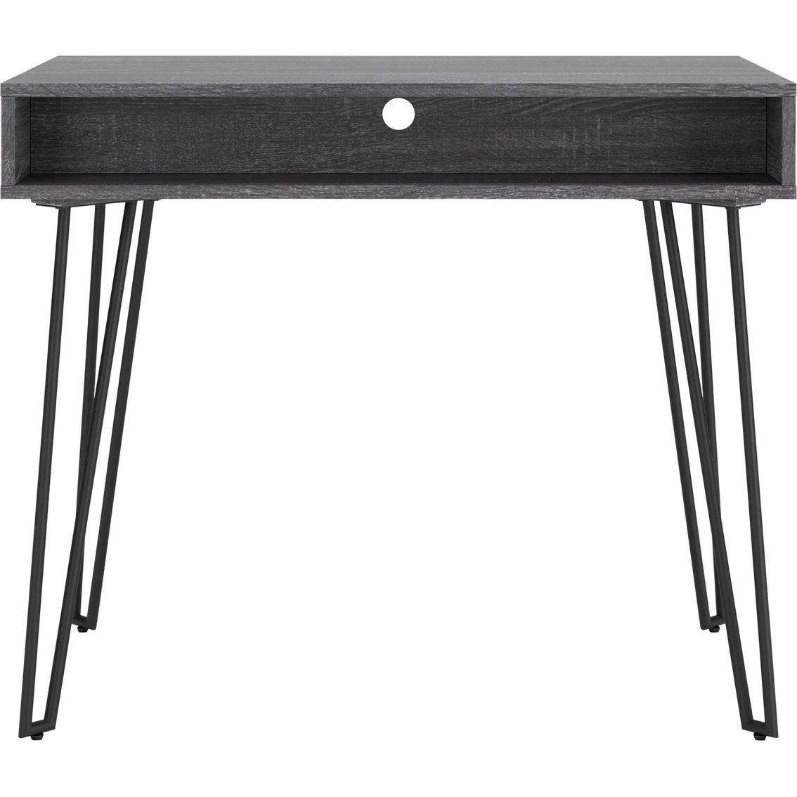 Sporting a sleek and simple profile, the Signature Design by Ashley Strumford 36 in. wide home office desk is casual contemporary at its finest. The desktop is wrapped in a replicated wood grain laminate and paired with decidedly mid-century style black legs for a familiar-yet-fresh design. And with an included open storage area and cord management raceway, this desk elevates your at-home workspace with both function and fashion. Featured item is desk only; images may show options. Assembly required. Model: H449-110.