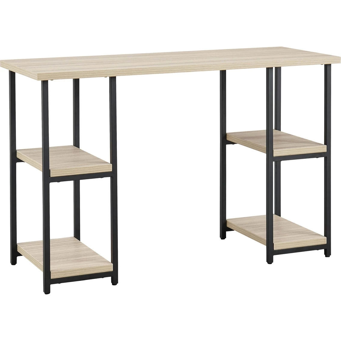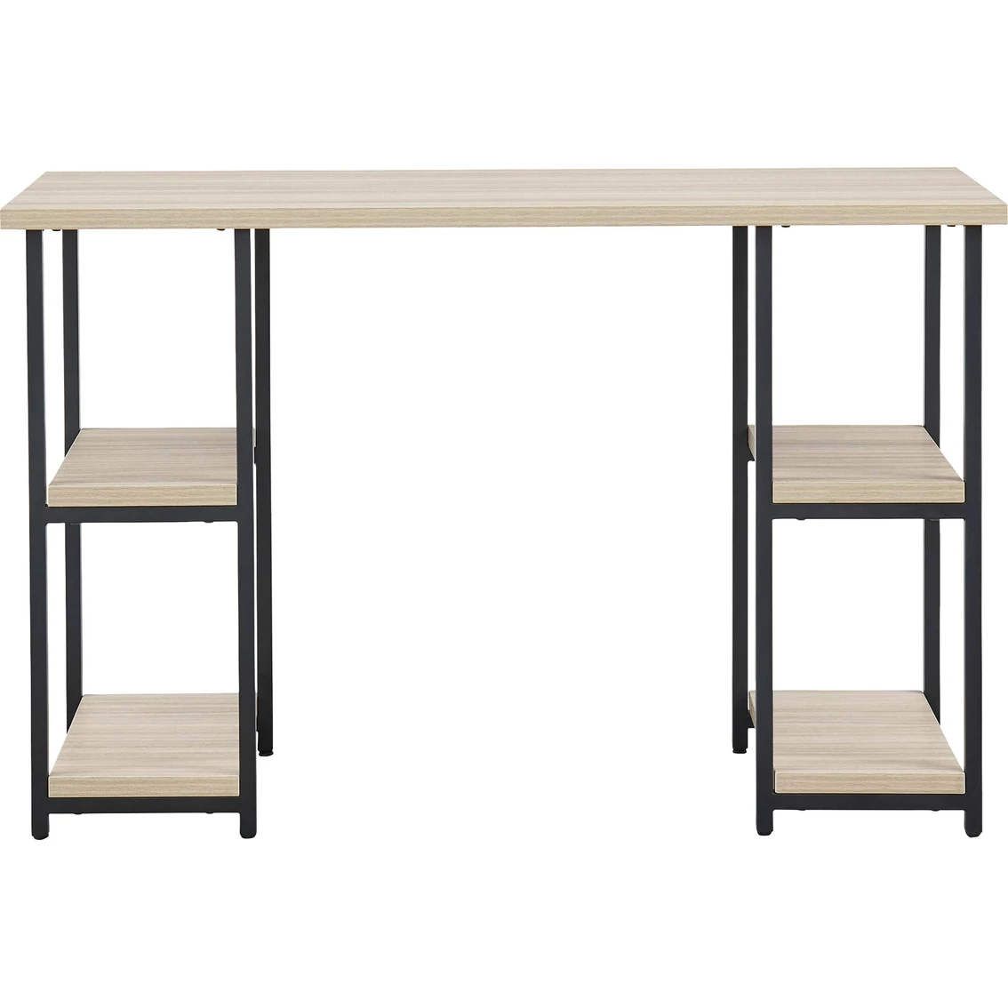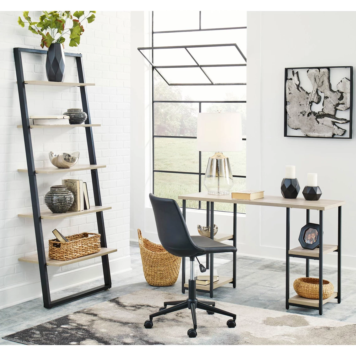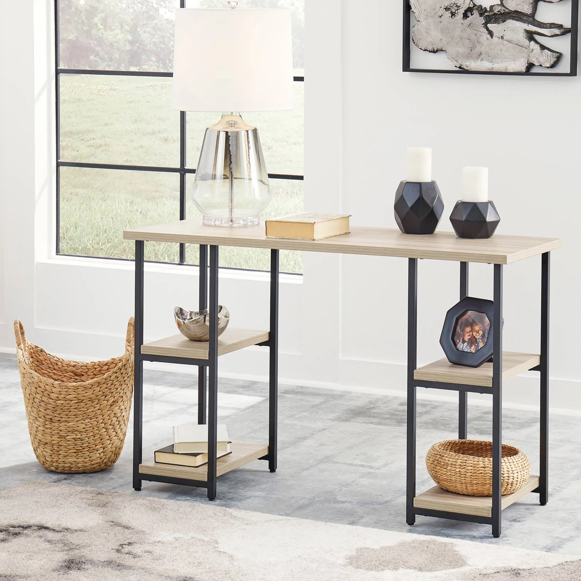 Contemporary meets casual for the ultimate office space. The Signature Design by Ashley Waylowe 48 inch Home Office Desk aims to please with its durable melamine top and metal base in a powder coated finish. The top features a replicated exotic wood grain in a light tan finish, while the double-shelf pedestal design makes this versatile piece perfect for your workspace. Dura Tuff surfaces are made of easy-clean melamine which is heat-, scratch- and water-resistant. Featured item is desk only, images show options. Assembly required. Model: H211-27.