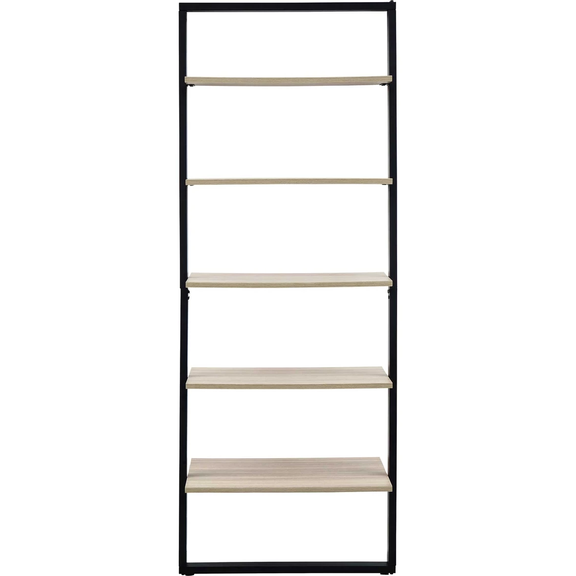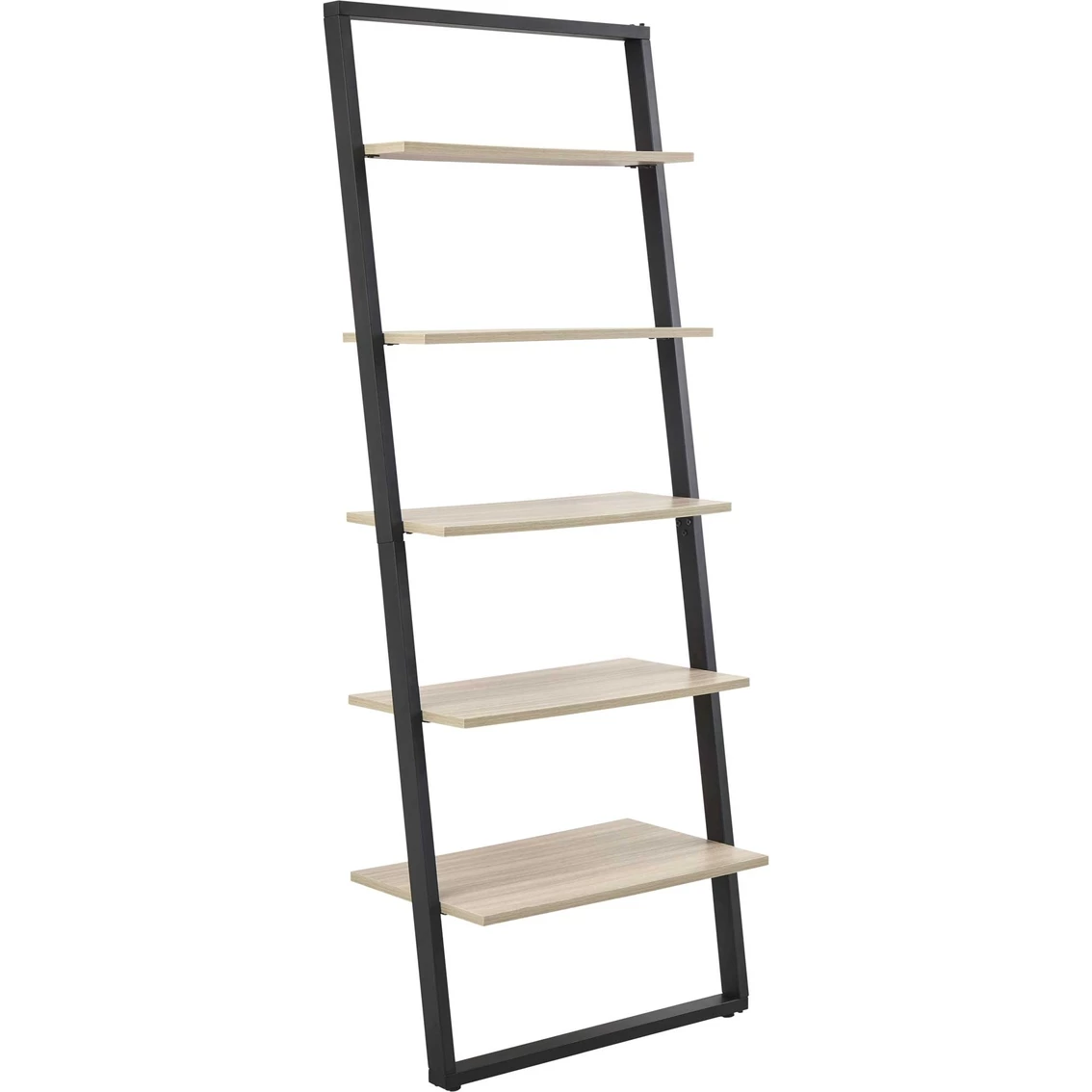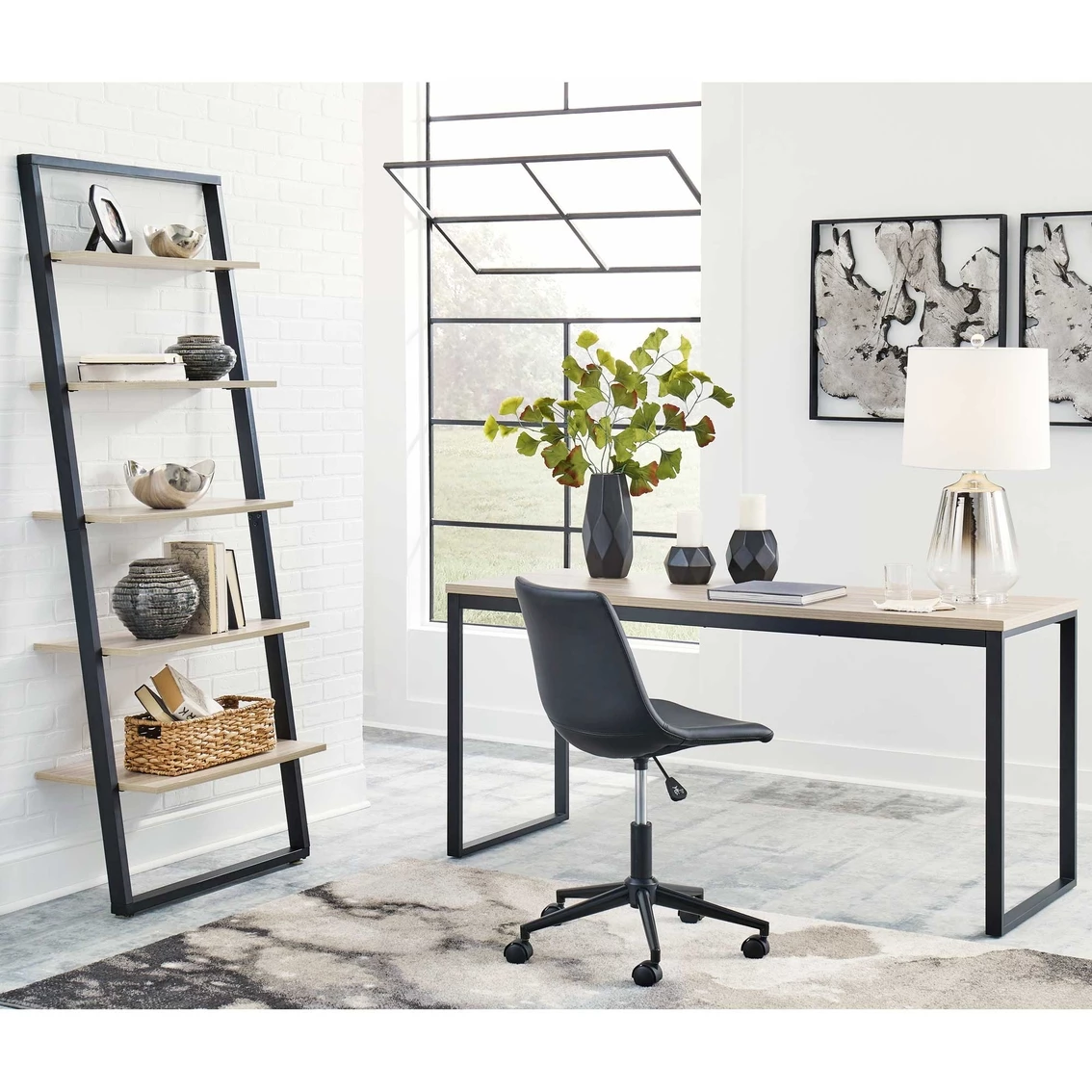 Contemporary meets casual for the ultimate office space. The Signature Design by Ashley Waylowe 74 inch Bookcase aims to please with its durable melamine shelves and metal base in a powder coated finish. The shelves feature a replicated exotic wood grain in a light tan finish, making this versatile piece the perfect display or storage space. Dura Tuff surfaces are made of easy-clean melamine which is heat-, scratch- and water-resistant. Featured item is bookcase only, images may show options. Assembly required. Model: H211-17.
