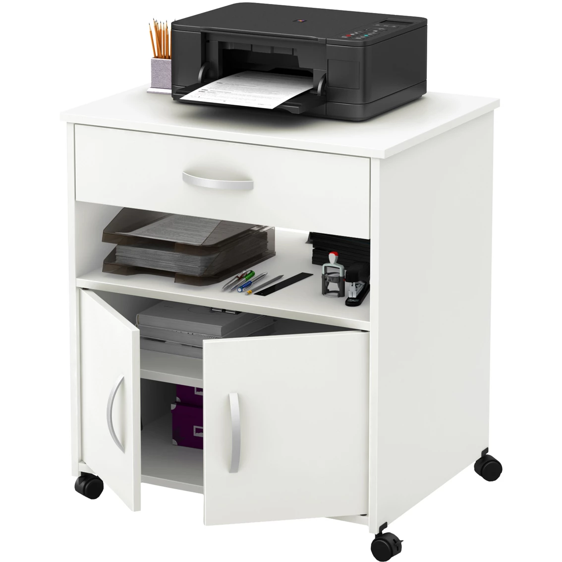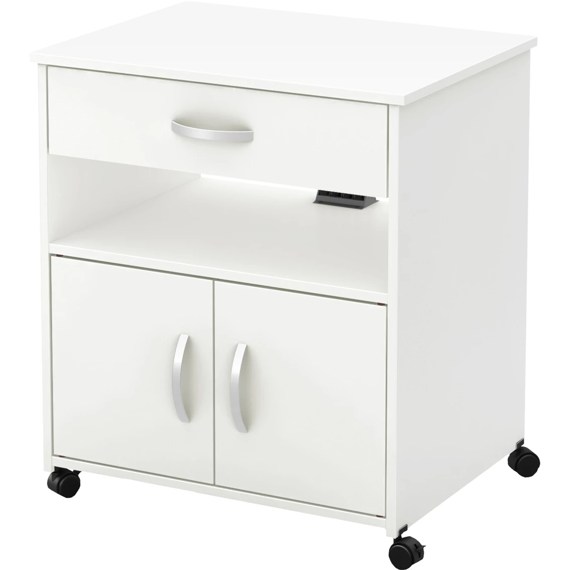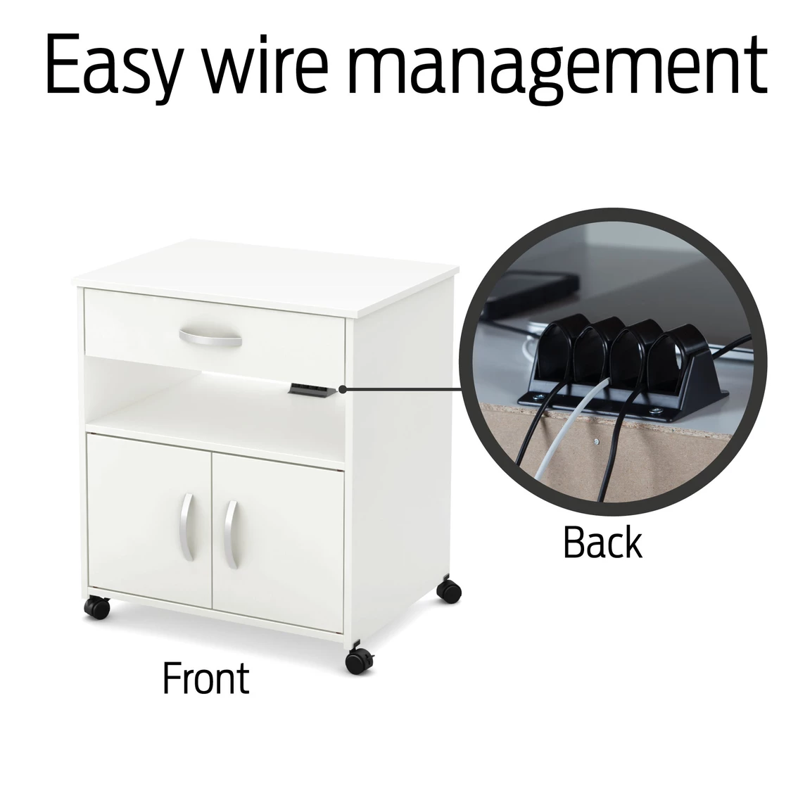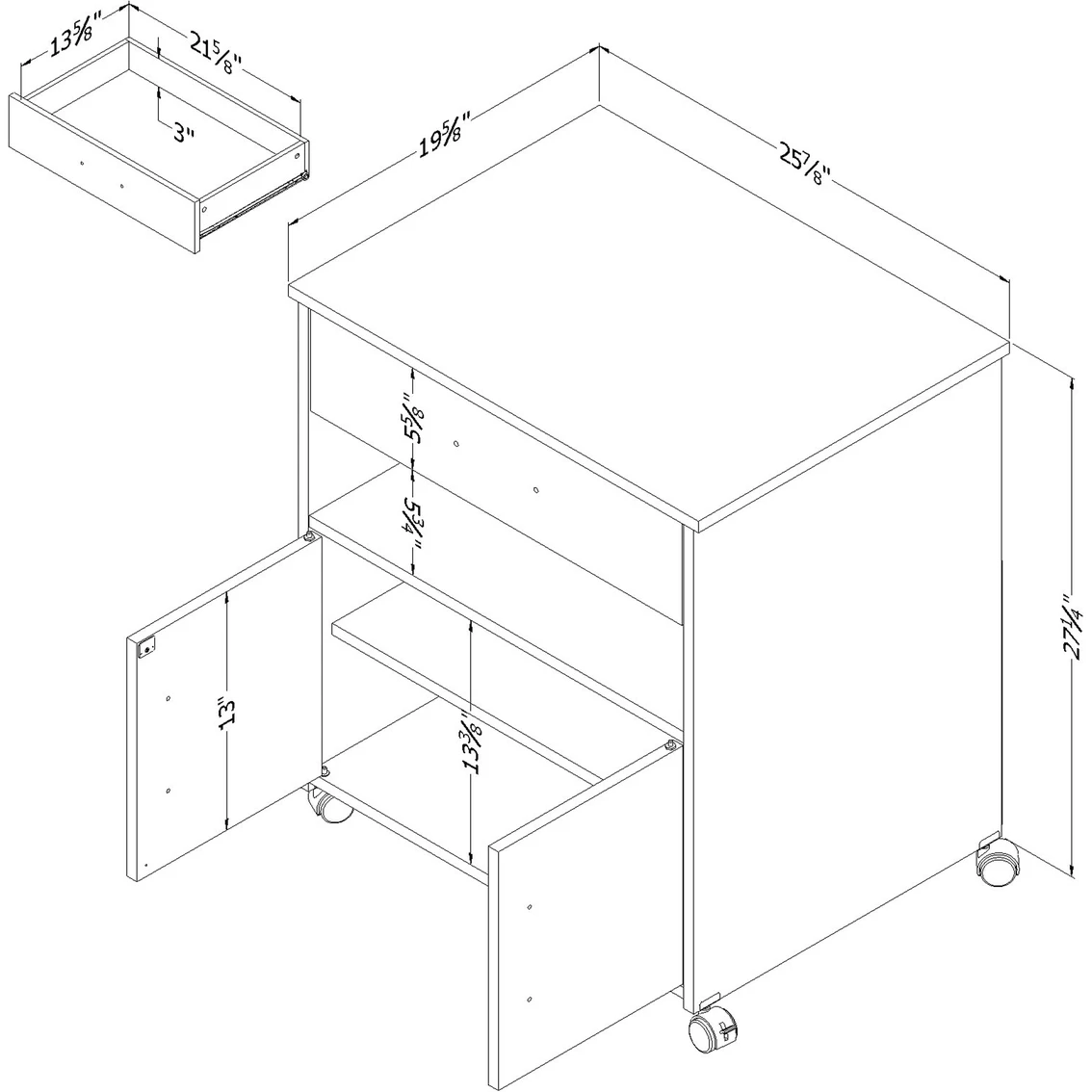 Work areas always need more room for storing things, and the South Shore Axess Printer Cart On Wheels is the ideal solution for adding some versatile storage space. Casters mean you can move it around easily so it’ll be of help in organizing your office efficiently. Features both open and closed storage spaces for a neat, orderly room. This cart has built-in brakes on two of the casters and plastic handles on the doors and drawer. 2 storage spaces behind the doors are separated by an adjustable shelf that holds up to 15 lb. The drawer has metal drawer slides. A cable grip is also included to keep cords together and tidy. All products come with a clear assembly document that will guide you through all steps. Exclusive 5-year limited guarantee. Product dimensions: 26.75 in. (W) x 19 in. (D) x 8.5 in. (H), 55.0 lb. Model: 9049691.