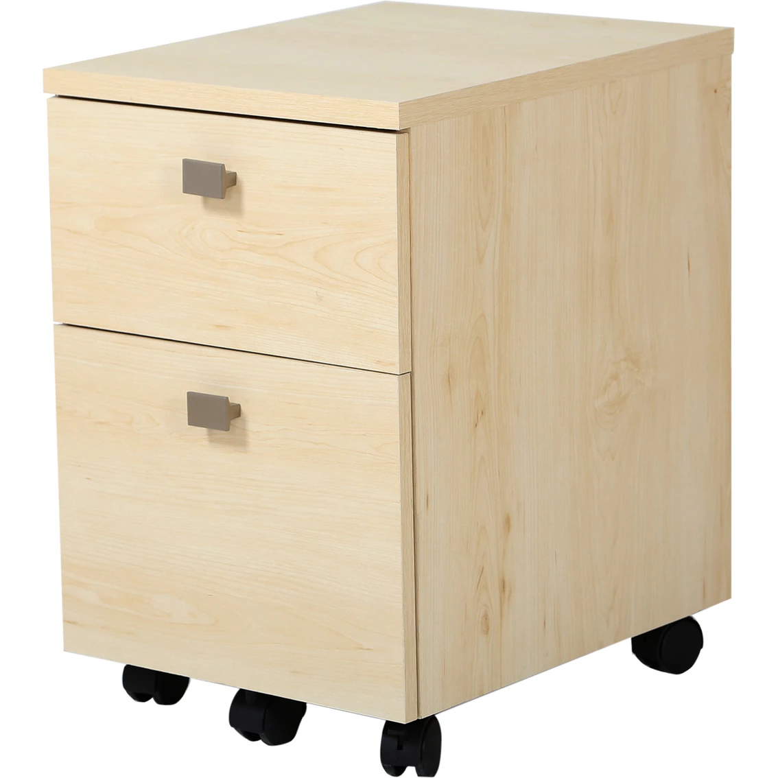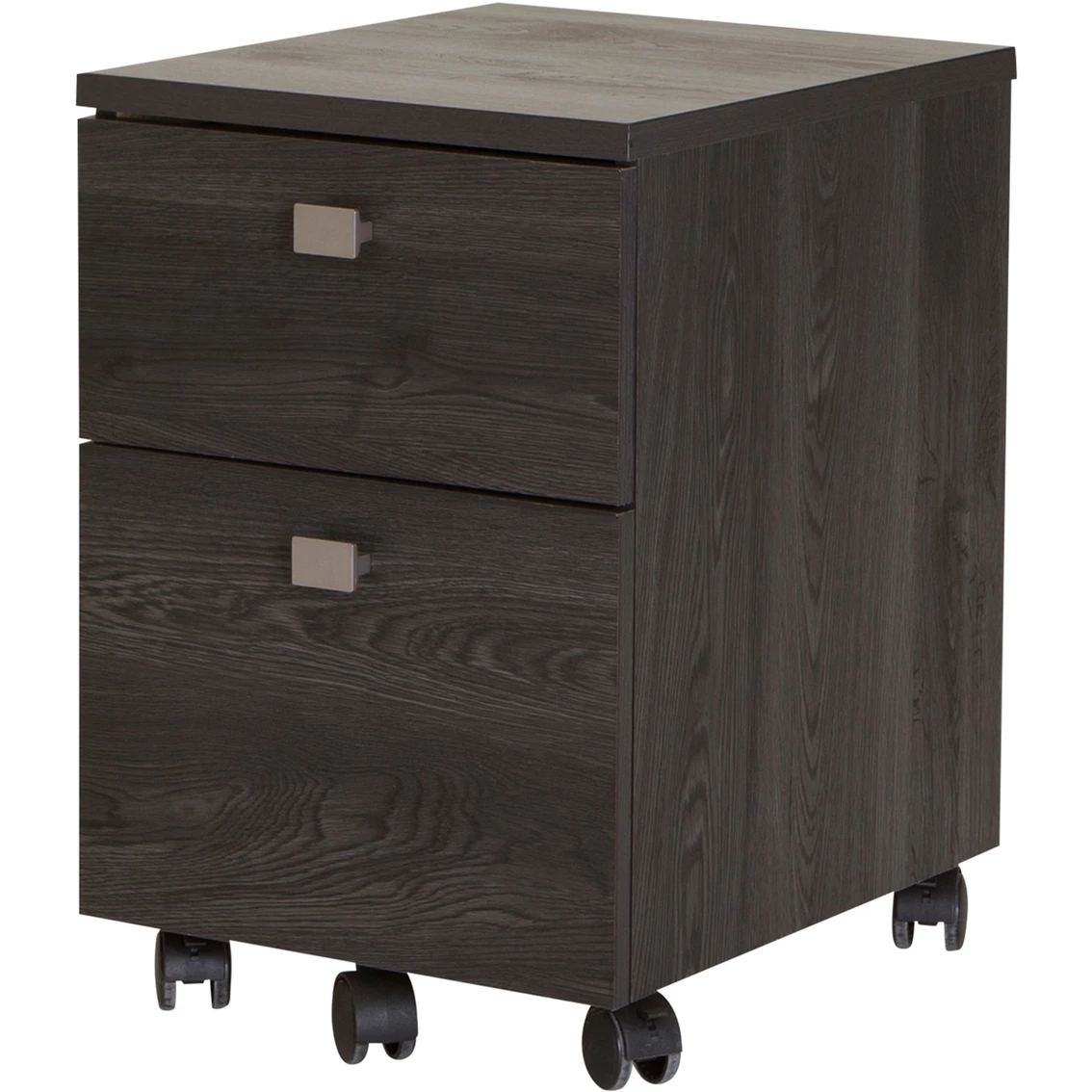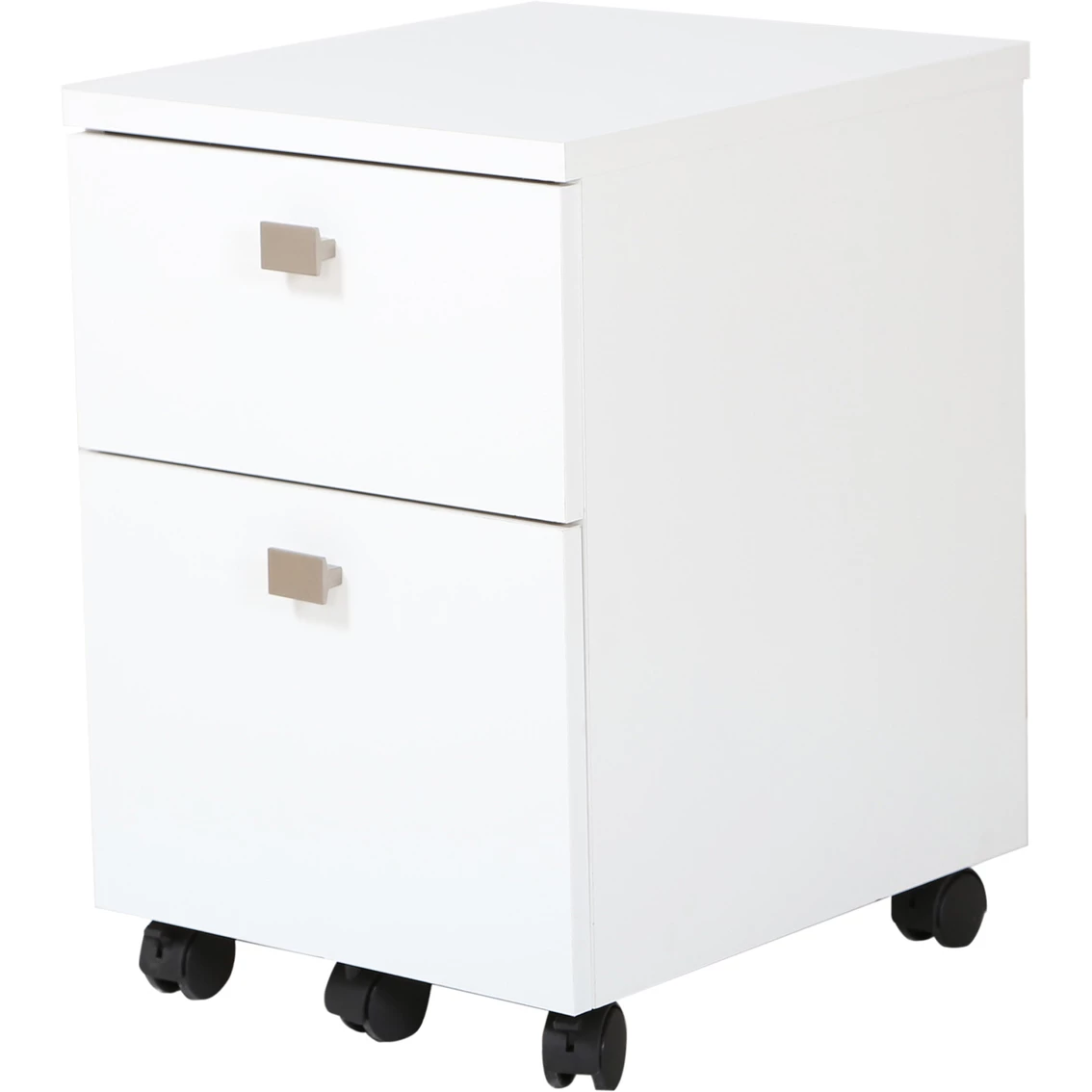 This elegant file cabinet from South Shore, part of the Interface collection, will please the biggest fans of contemporary style furniture. Its beautiful metal handles with a satin nickel finish give it a modern, sought after look. The file drawers come with plastic rails, to hold either letter or legal size hanging folders, and the four casters with built-in brakes make moving the unit around simple and practical. The one supporting caster under the lower drawer helps keep it stable. It’s the perfect location for a printer and can be stored under a desk to free up more space. Set it up in the home office, living room or bedroom, and take advantage of the full-extension metal slides on the lower drawer and the metal drawer slides on the upper drawer. Accessories not included. Requires complete assembly by two adults. Tools not included. Packaging tested and certified to reduce the risk of damage during shipment. Made in North America with non-toxic laminated particleboard. Model: 9026691.