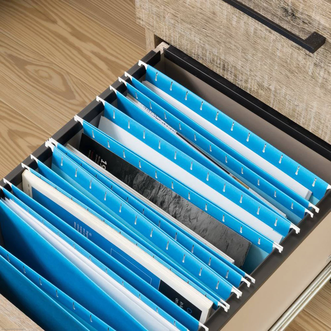 - File drawers come with plastic rails to hold either letter or legal size hanging folders