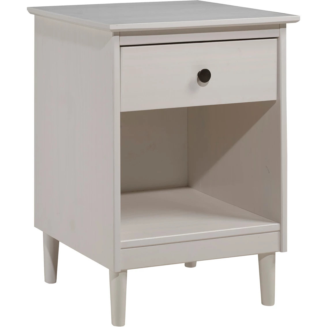 Providing a modern spin on a traditional style, this 1-drawer wood nightstand from Walker Edison offers a classic and simple design. Features include a spacious drawer for keeping your room essentials hidden and a lower open shelf for your book or magazine collection. The boxy frame and mid-century inspired tapered legs are made from sustainably-sourced solid pine and manufactured wood for a solid, reliable piece you can count on. Position next to your bed as a nightstand or in the living room next to your couch as a side table to add a bit of charm to your space. Model: BR1DNS.